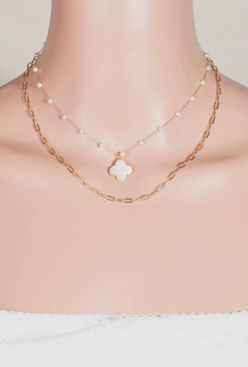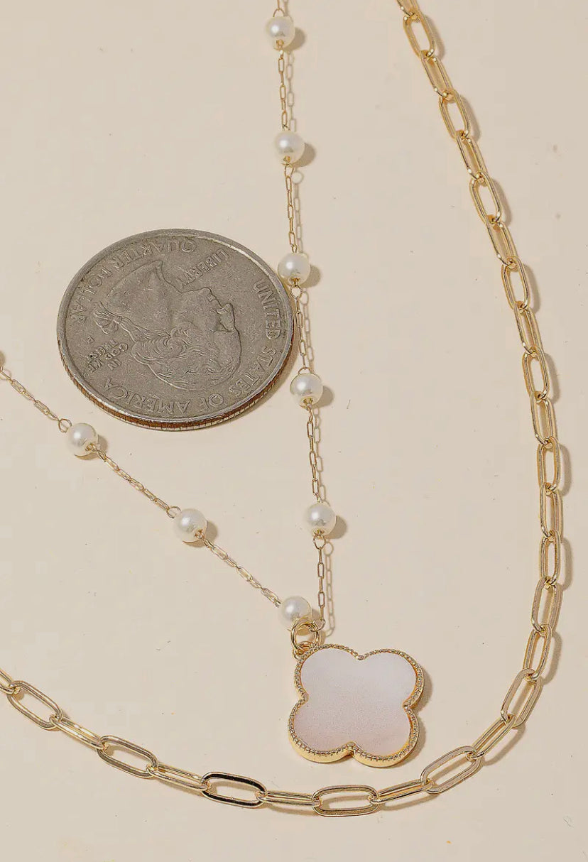 A bold and daring choice, perfect for those who want to stand out from the crowd, this necklace offers a remarkable pearl clover pendant and beads layered chains design. Embrace fashion flexibility with this versatile necklace, designed to effortlessly enhance the sophistication of any outfit. This necklace is made with 80% Metal and 20% Fresh Water Pearl.