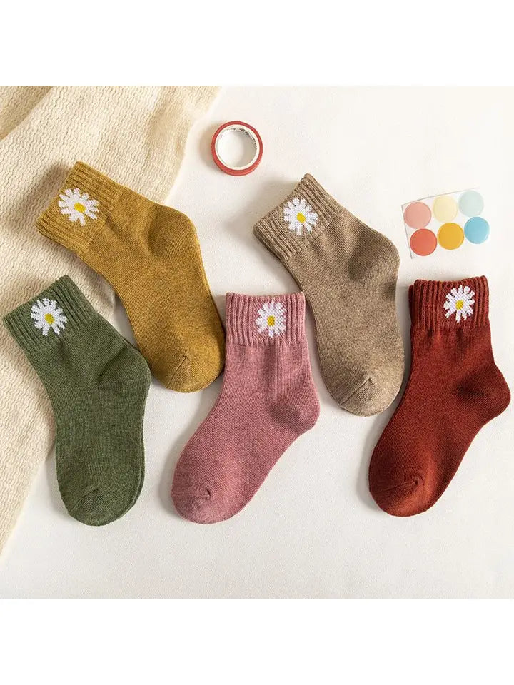 Product Introduction: Get your little ones ready in style with our cotton-polyester-ammonia blend daisy-patterned mid-calf socks. This pack of five pairs is perfect for everyday wear, adding a touch of charm to any outfit with its cute and playful design. Increase their charm and comfort with our daisy-patterned mid-calf socks.