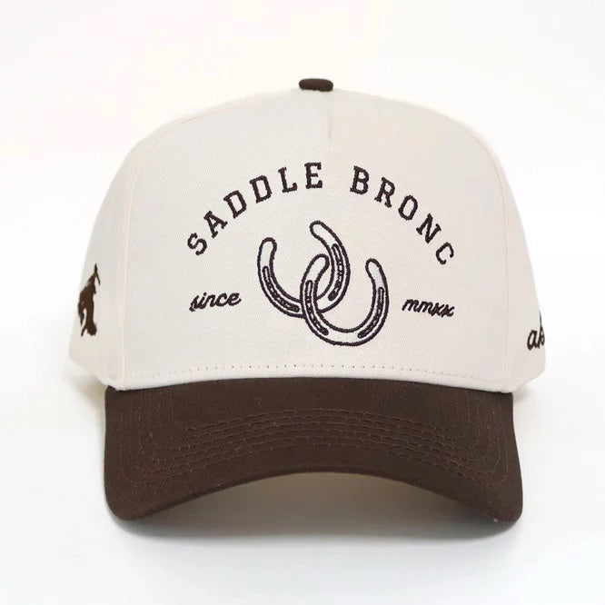 Embroidered text “SADDLE BRONC since mmxx” featuring an embroidered horseshoe logo on front.