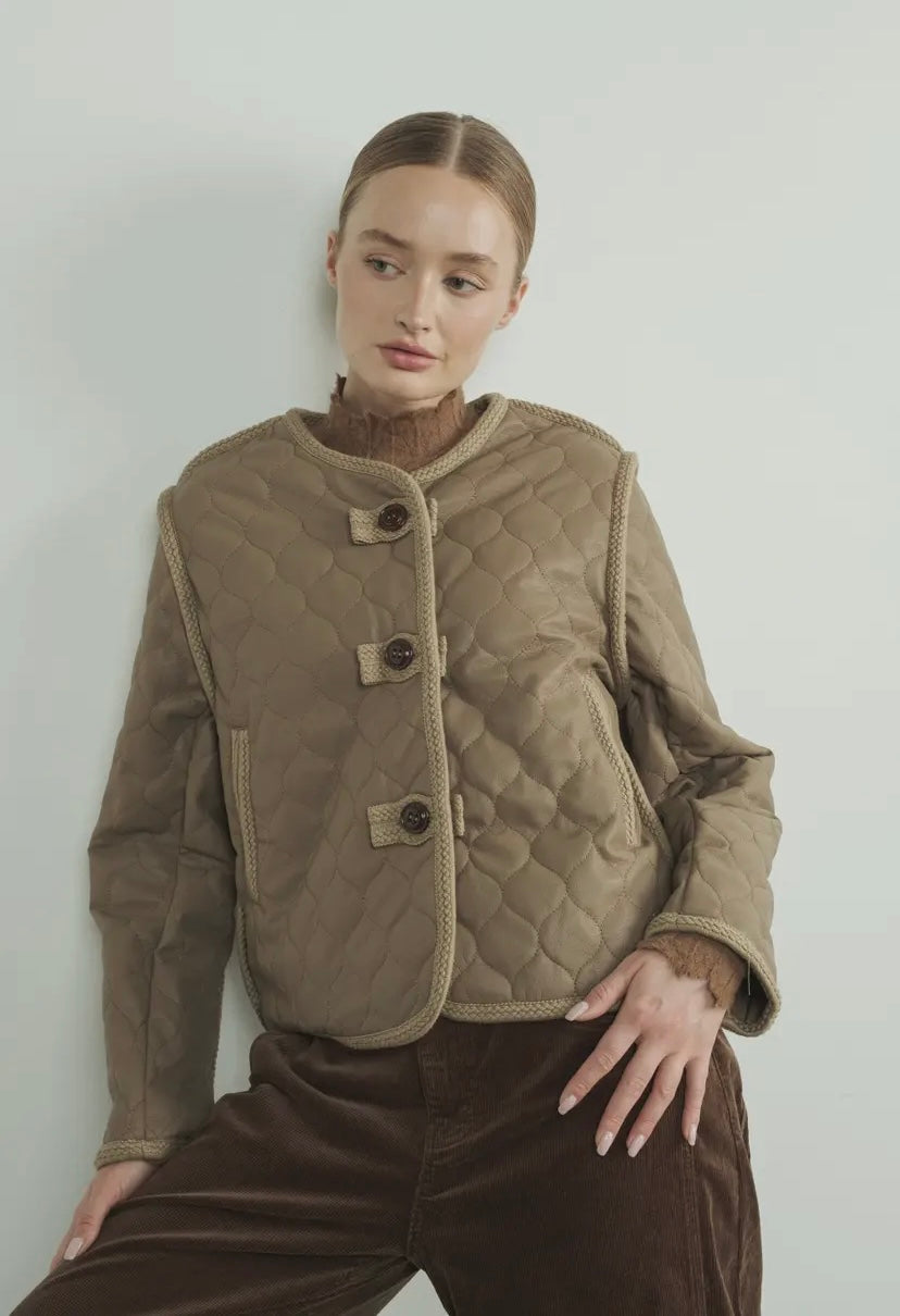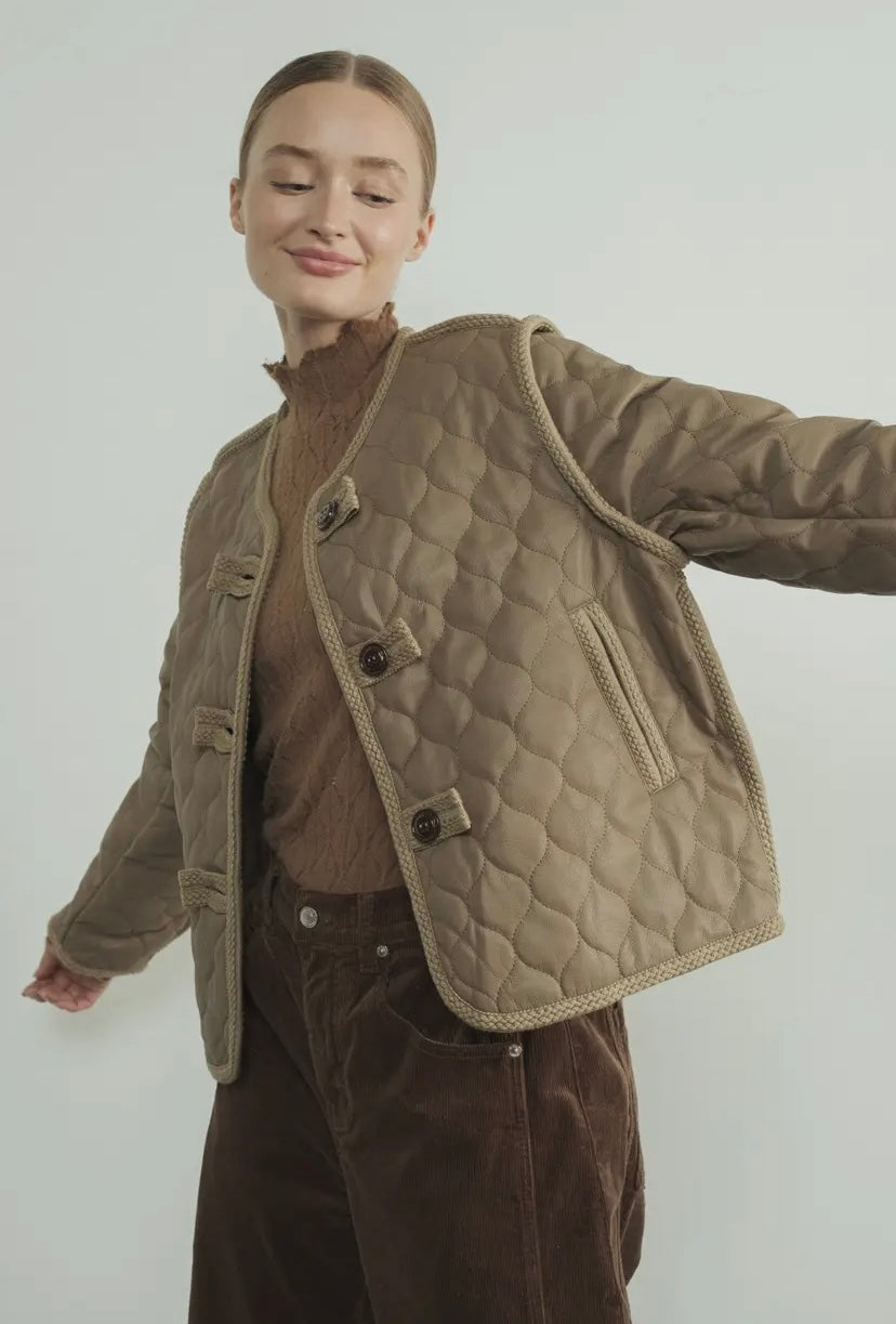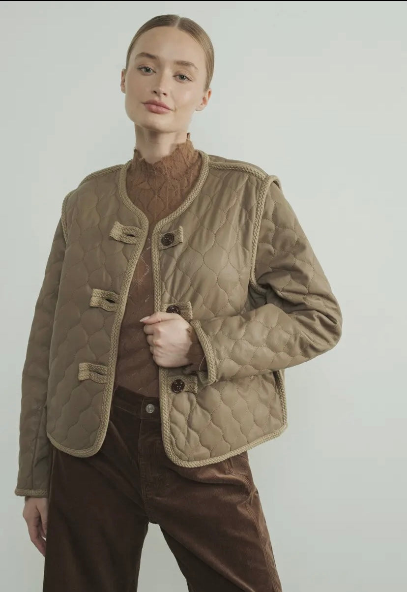Meet our quilted silhouette. Inspired by the classic and casual, this piece has a roomy fit, button down and a below-the-waist hem. features soft faux leather and edge stitch detailing