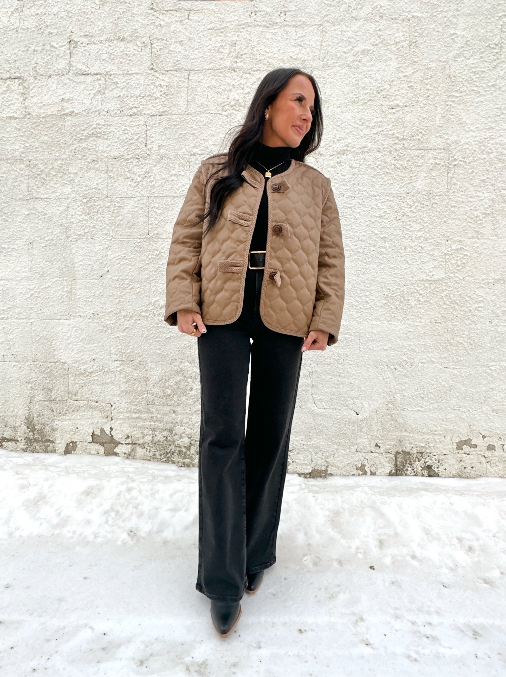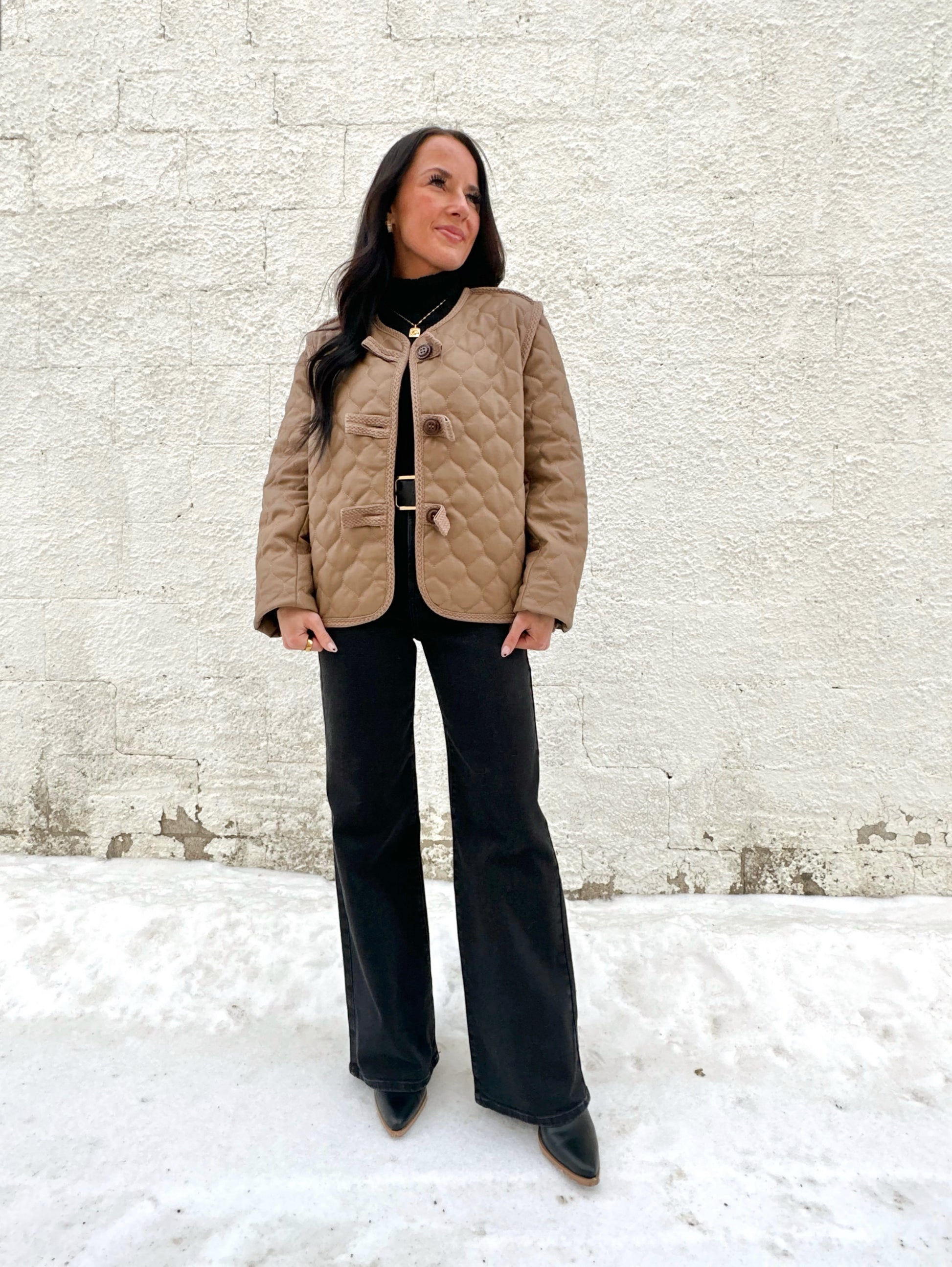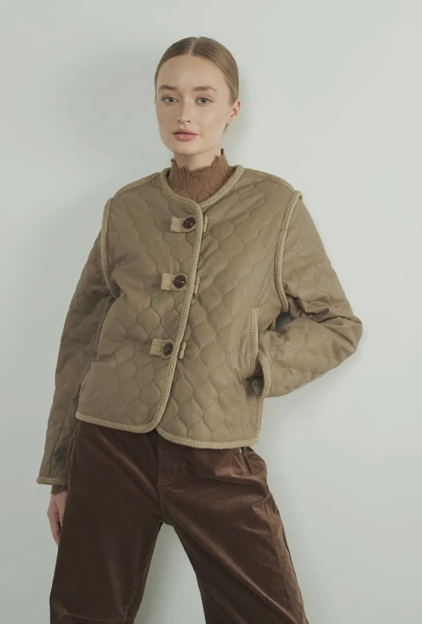 Meet our quilted silhouette. Inspired by the classic and casual, this piece has a roomy fit, button down and a below-the-waist hem. features soft faux leather and edge stitch detailing