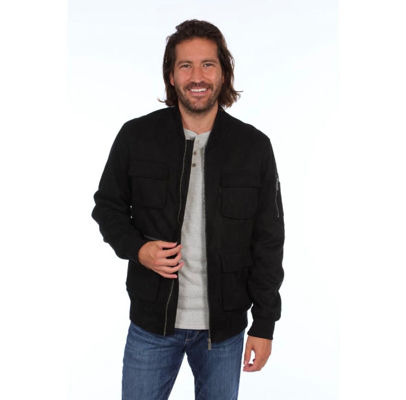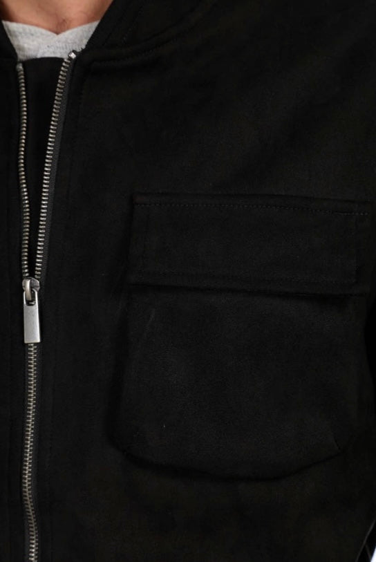 A cozy fitted faux suede bomber jacket with multiple cargo pockets.