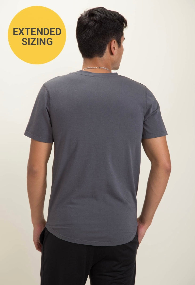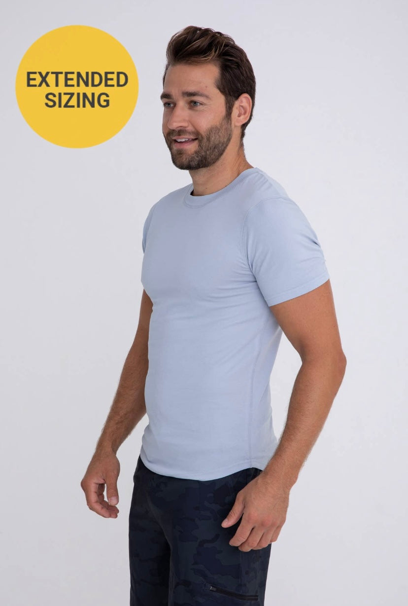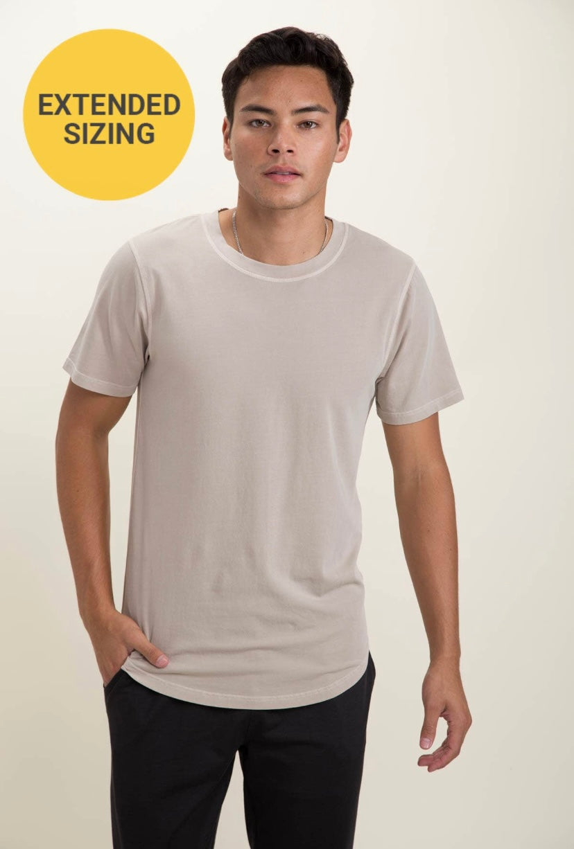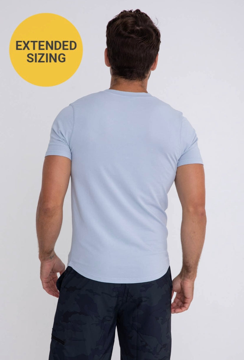 Stretchy and breathable (thanks to the pima cotton and spandex fibers), this t-shirt features a scalloped rounded hem on the side, has a round neckline, short sleeves, and topstitch across the neckline and the armhole.
