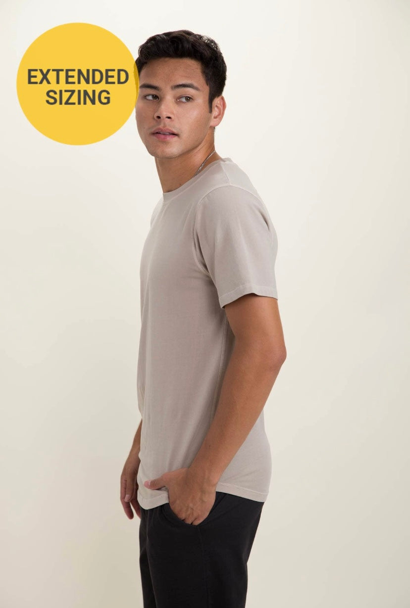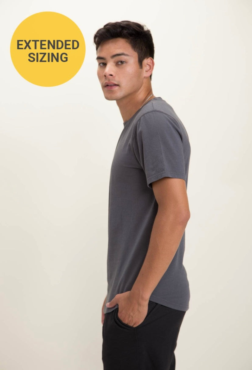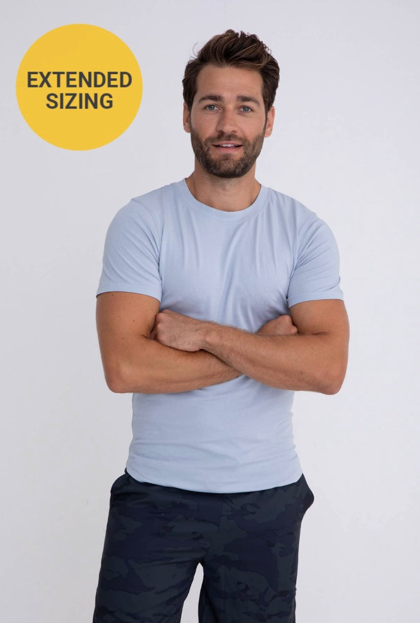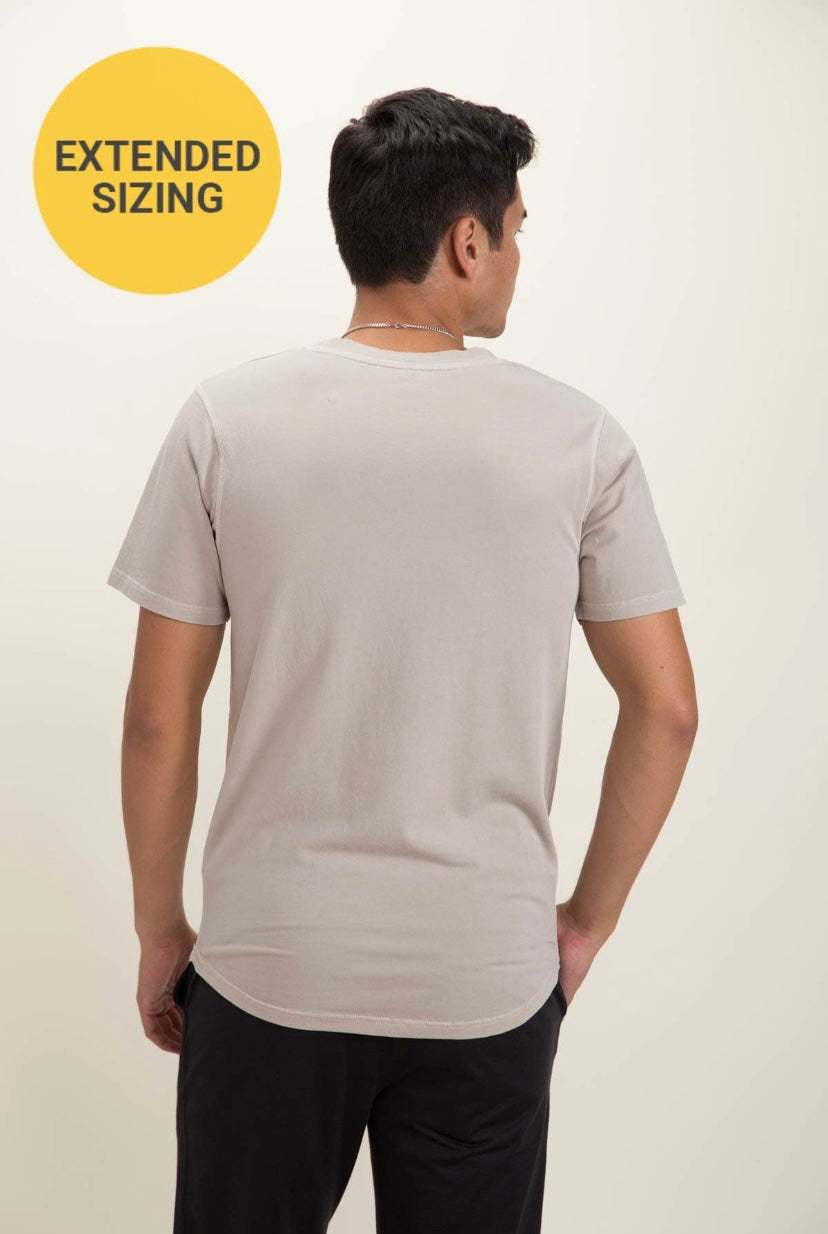 Stretchy and breathable (thanks to the pima cotton and spandex fibers), this t-shirt features a scalloped rounded hem on the side, has a round neckline, short sleeves, and topstitch across the neckline and the armhole.