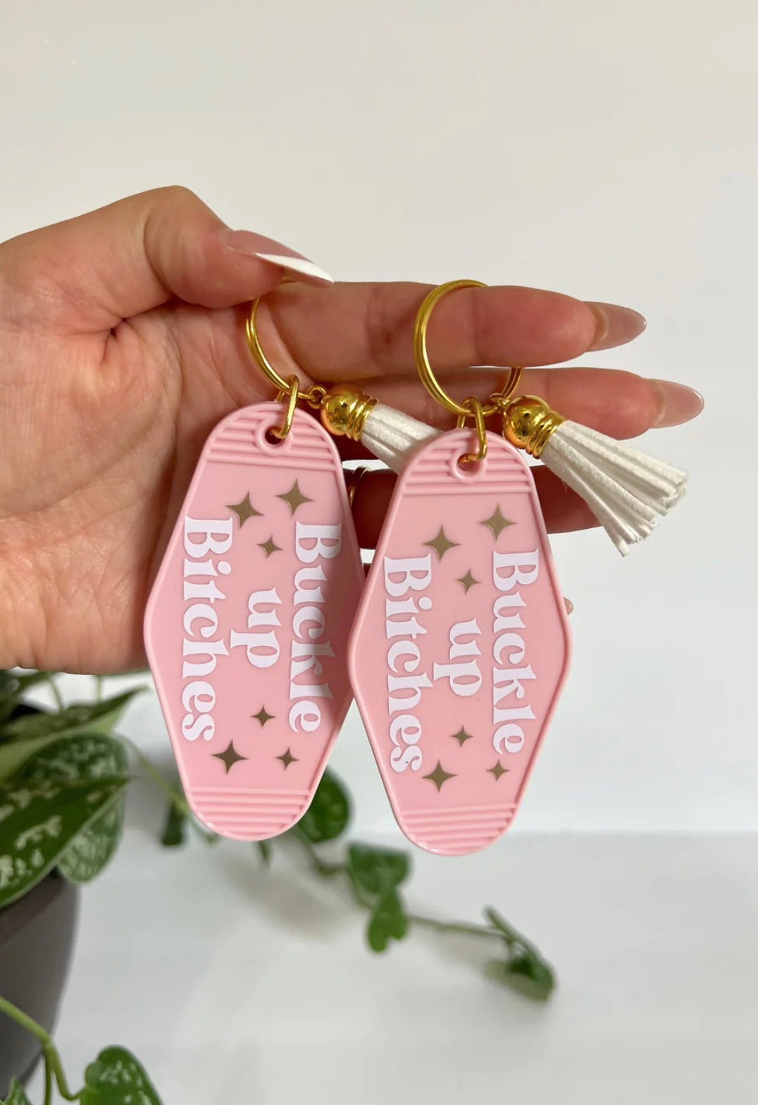 This keychain is the perfect accessory for your keys. This retro-style motel keychain features the phrase "Buckle Up Bitches". It's a simple, stylish accessory that adds a touch of fun to any set of keys!