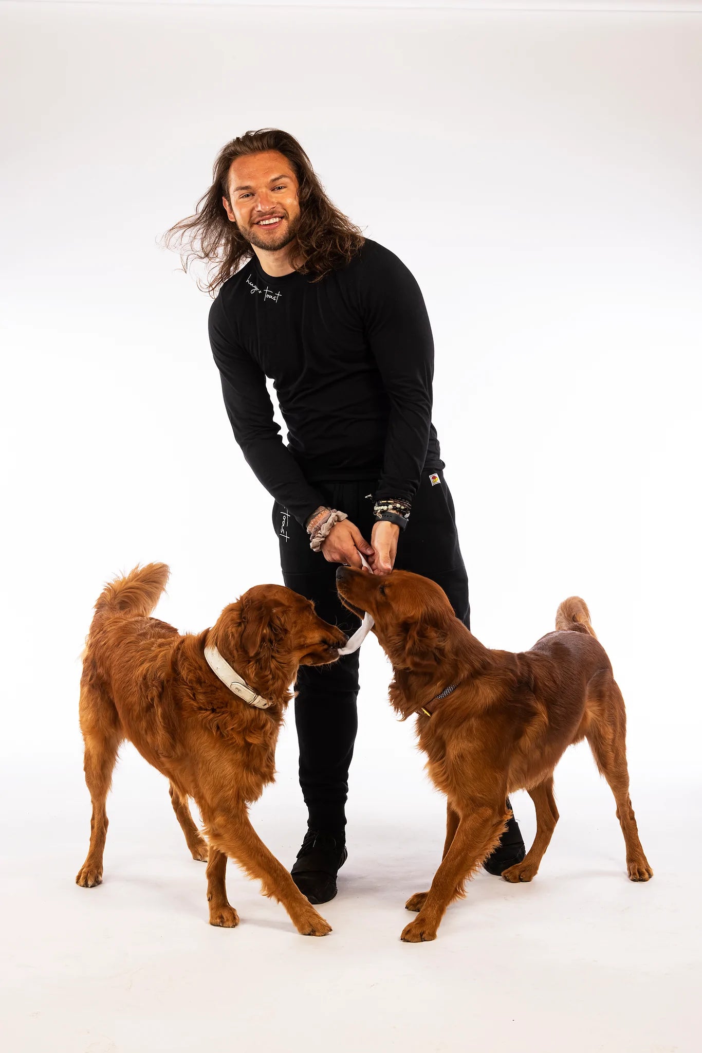 Matthew is wearing a size medium in the photo. He is 6’1 and 190lbs. His measurements are 39” chest, 34” waist, and 40” hips.