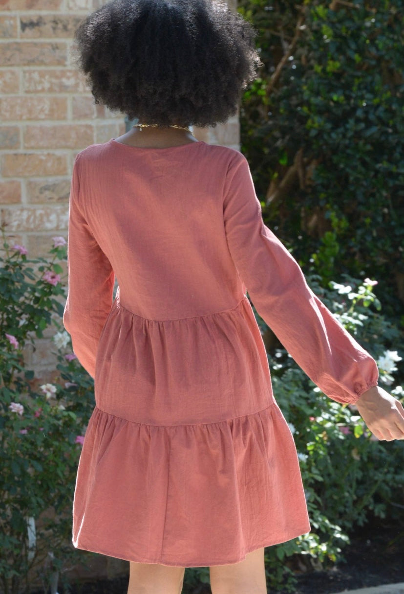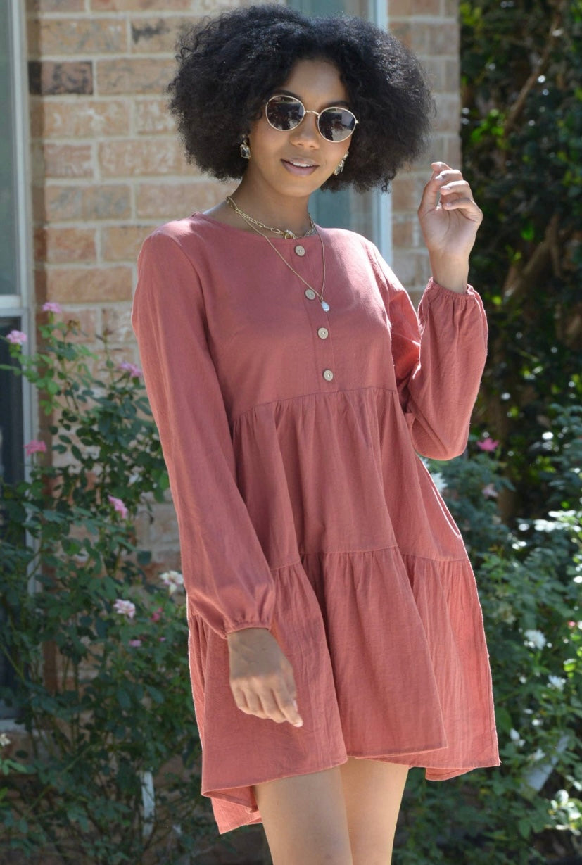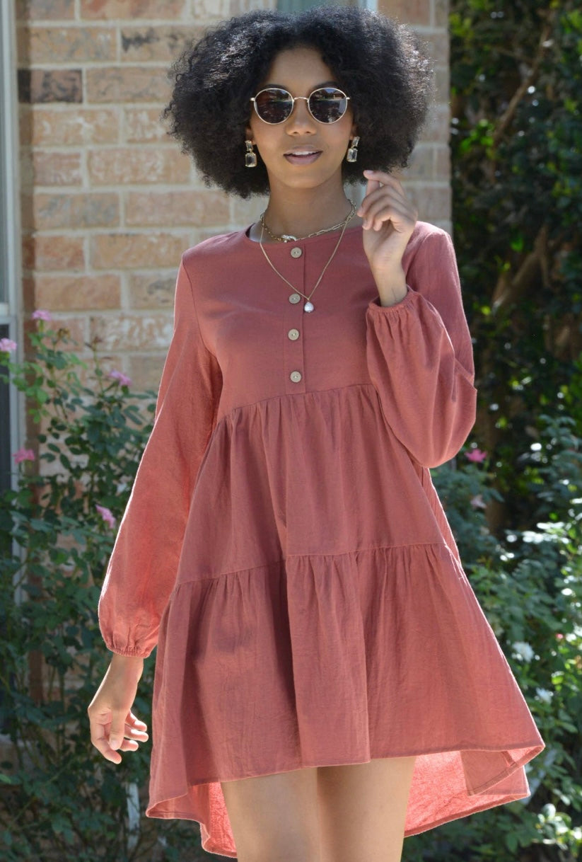 Button Up Clara Redwood. The Button-up Rounded neckline Solid Color Woven Mini Dress is a fashion must-have! * Woven fabric * Rounded neckline * Long sleeves * Solid color * Stretchy cuffs * Buttons closure * High-waisted fit * Relaxed silhouette * 35%cotton65%polyester * Unlined