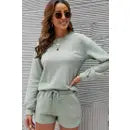 The casual knitted two piece set is a lightweight knitted fabric that includes a round neckline long sleeves top, and a drawstring high waist mini short.