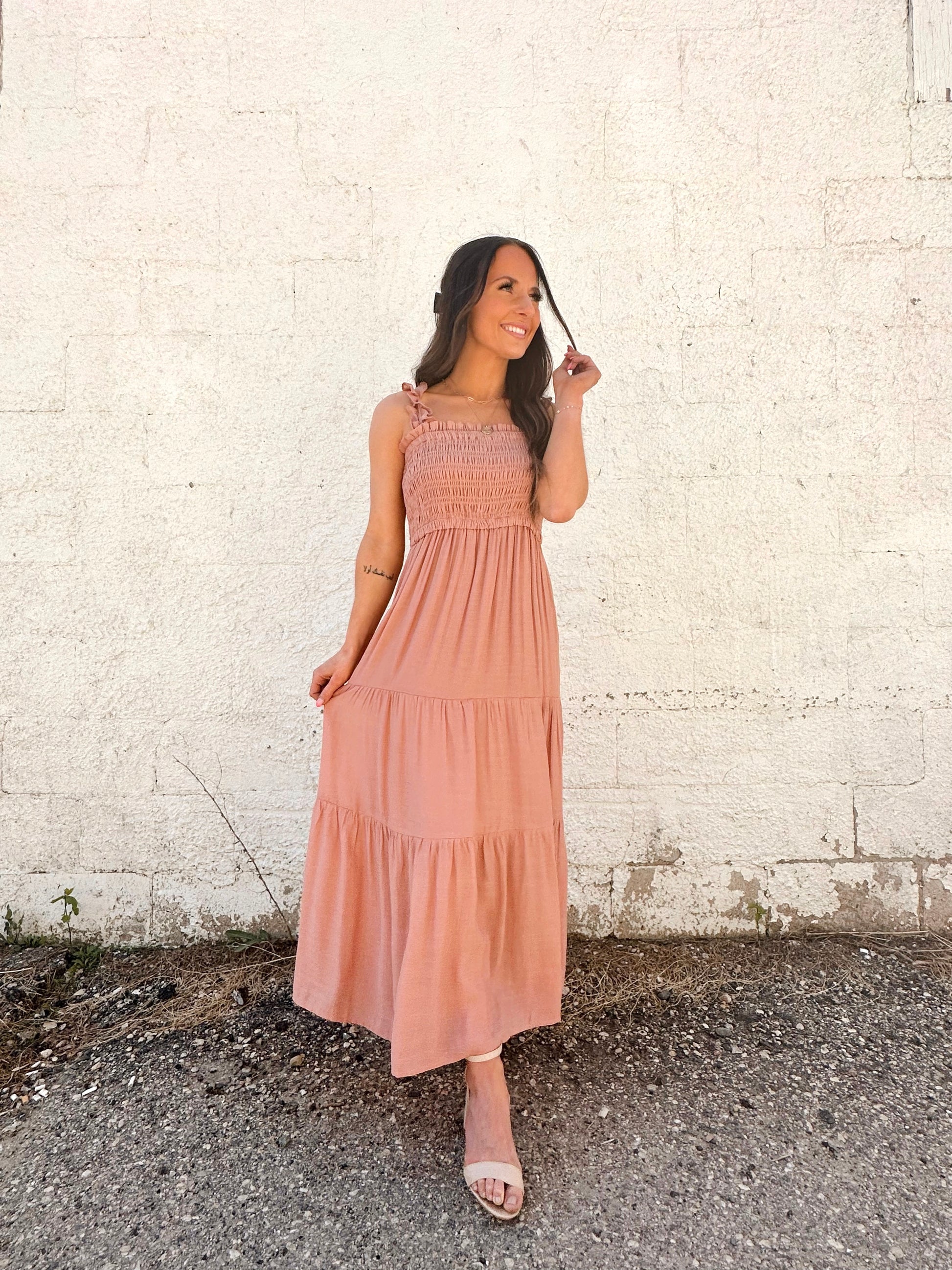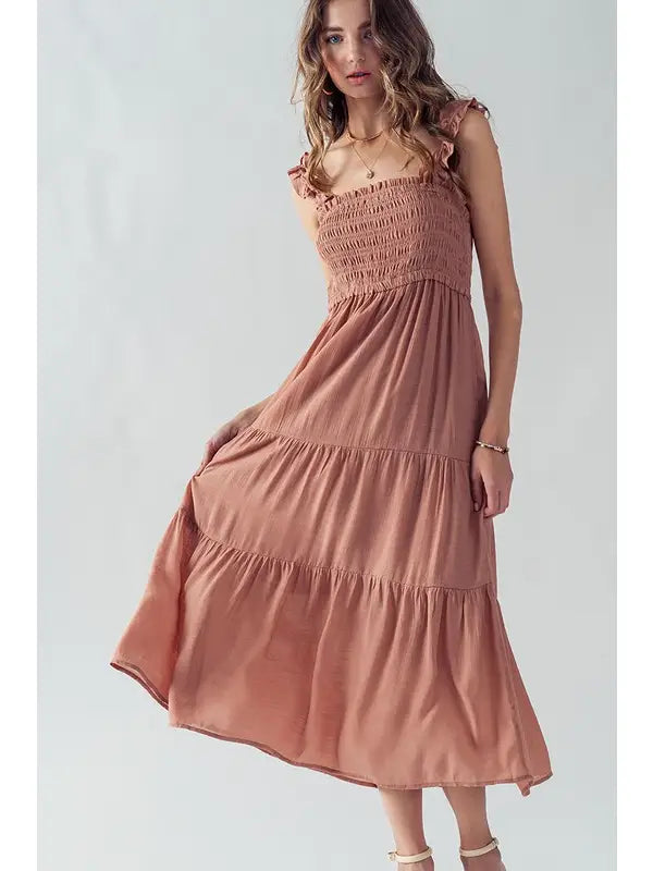 Mid Length Ruffled Sleeveless Square Neck Open Back Smocked Dress