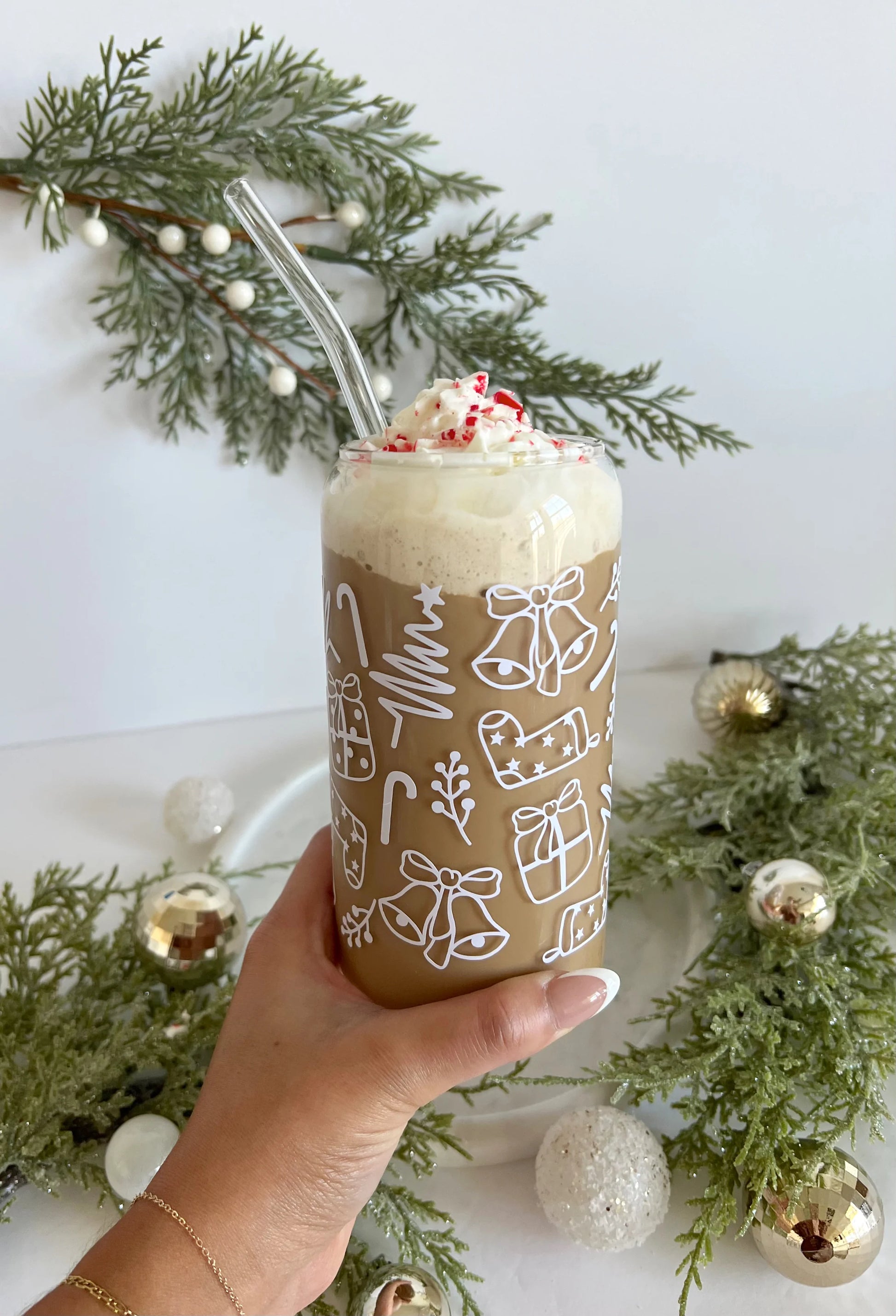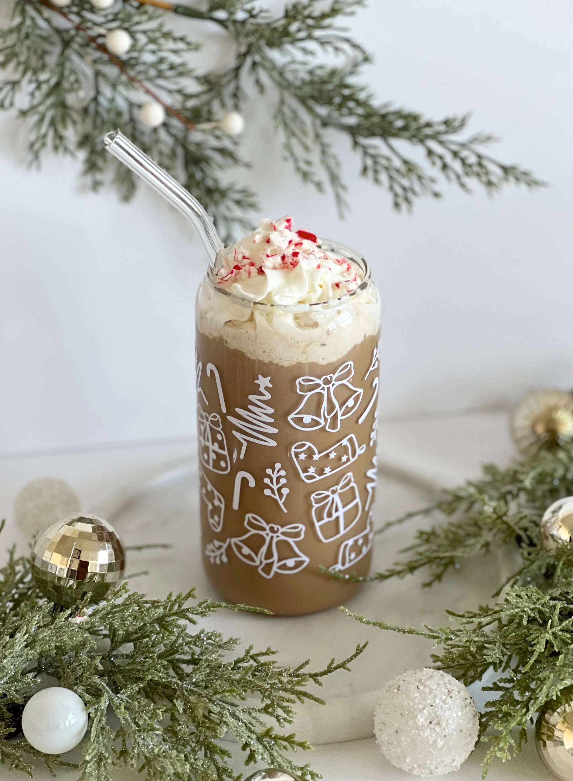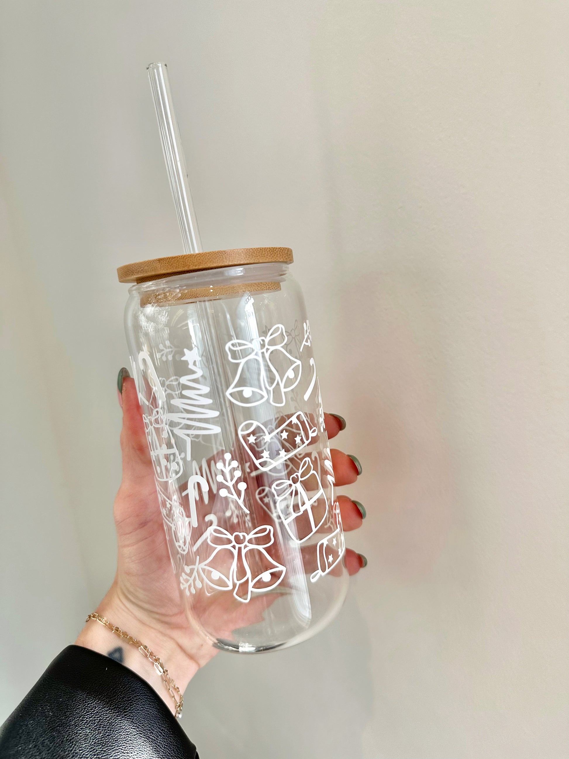 This holiday-themed glass with festive Christmas doodles, is perfect for cozy winter sipping! Enjoy your favorite drinks in style with this unique drinking glass.