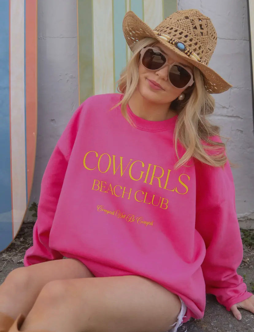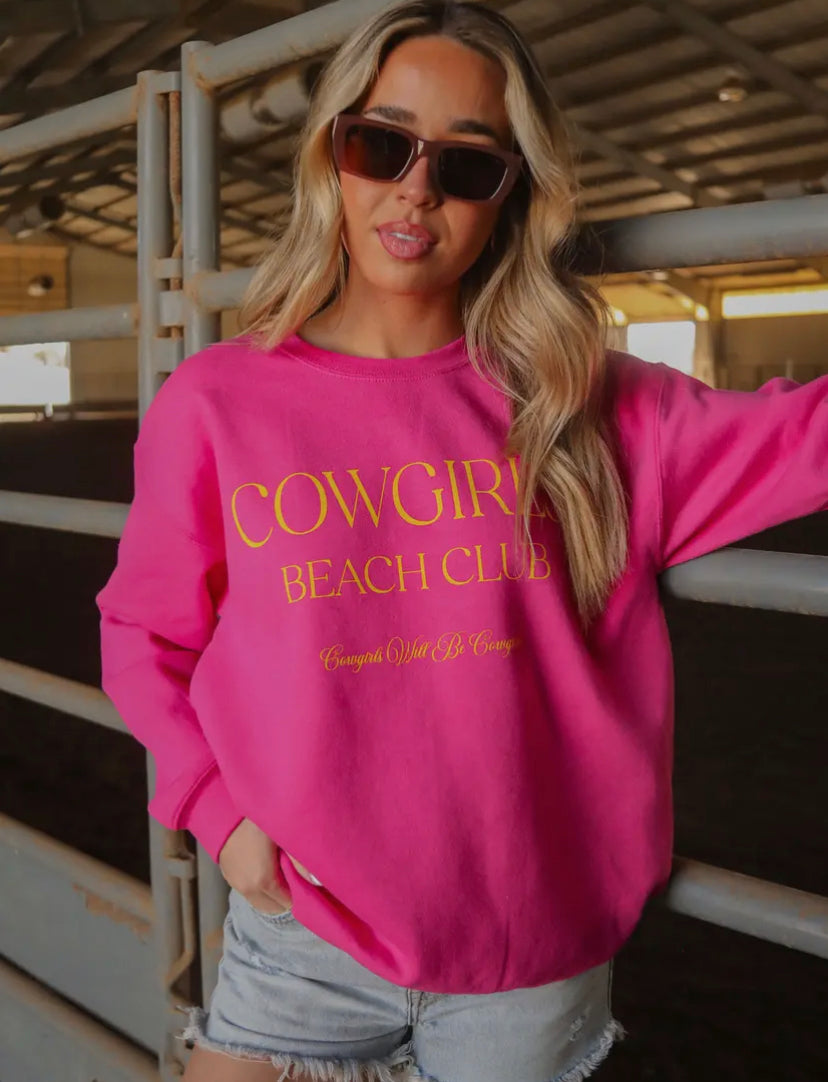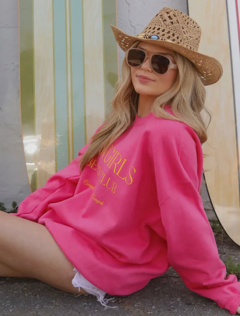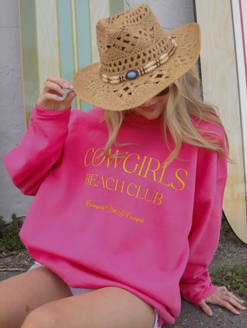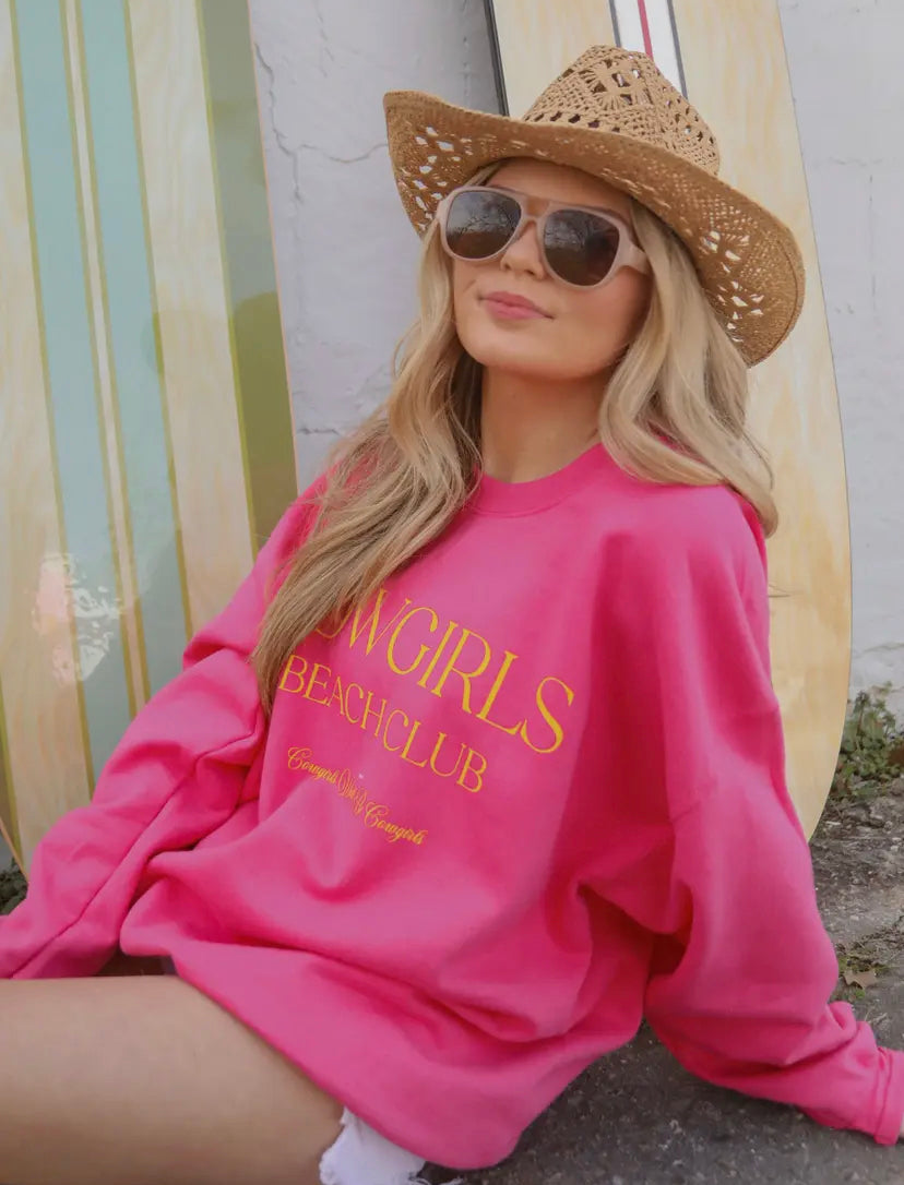 For the girls wishing they were horseback riding on the coast with an Apperol Spritz in hand- this one's for you! One of our favourite sweatshirts from this collection perfectly captures the coastal cowgirl vibe on a summer pink sweatshirt with lemon yellow text.