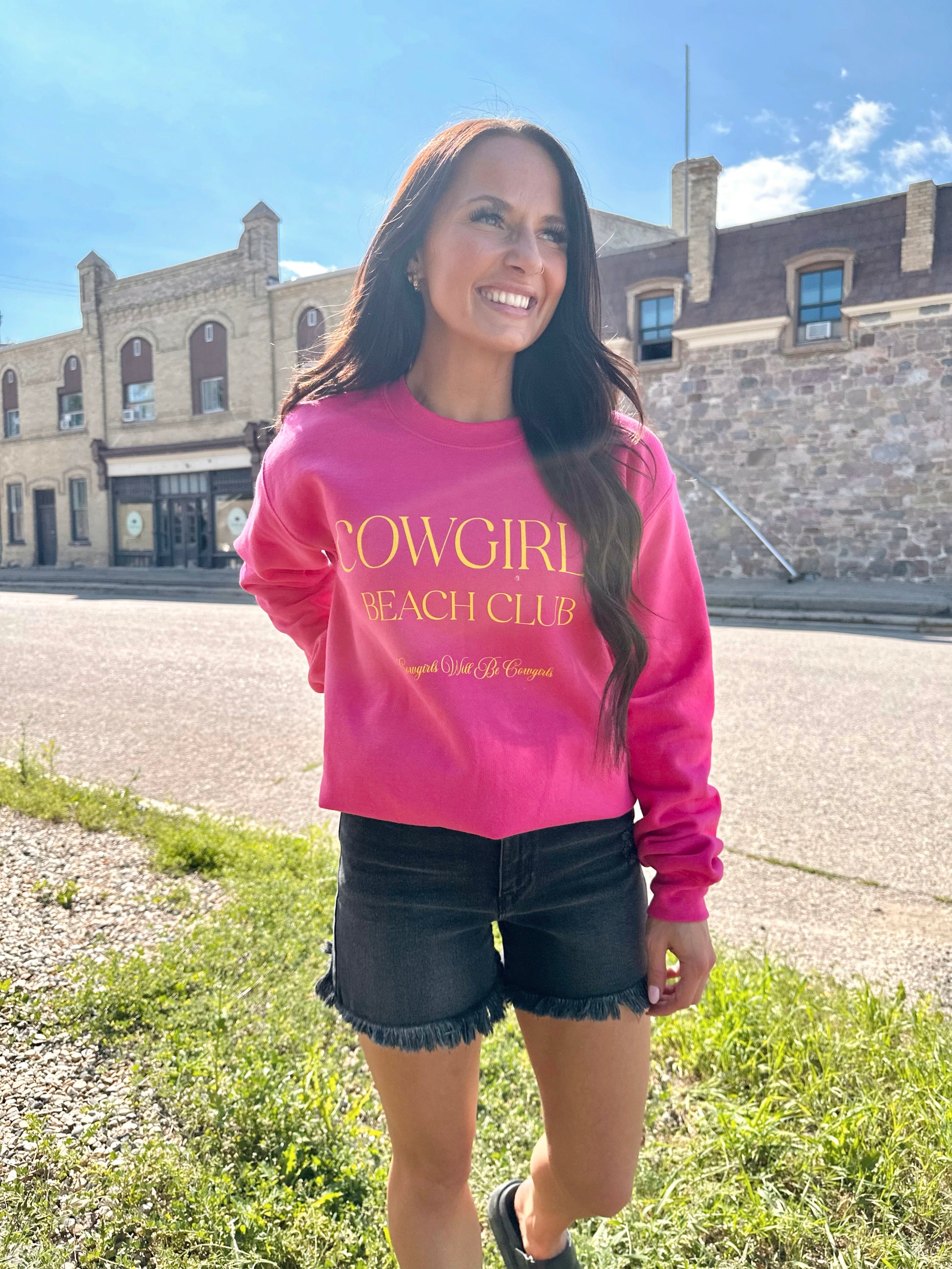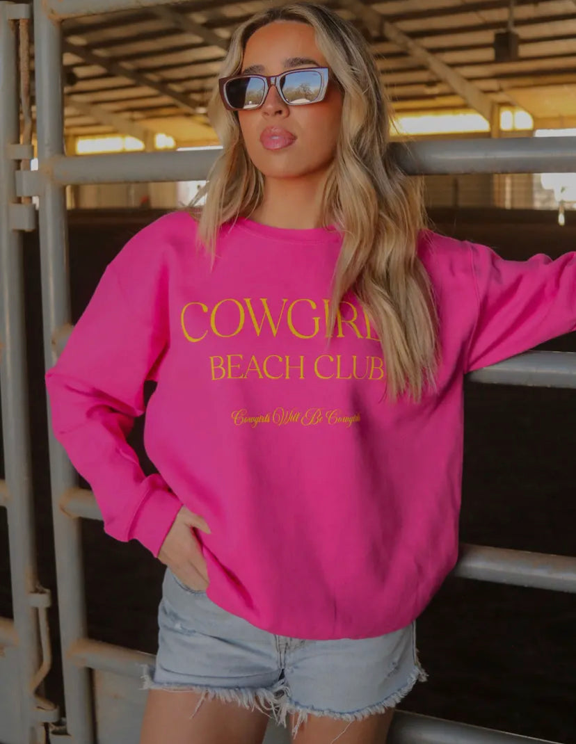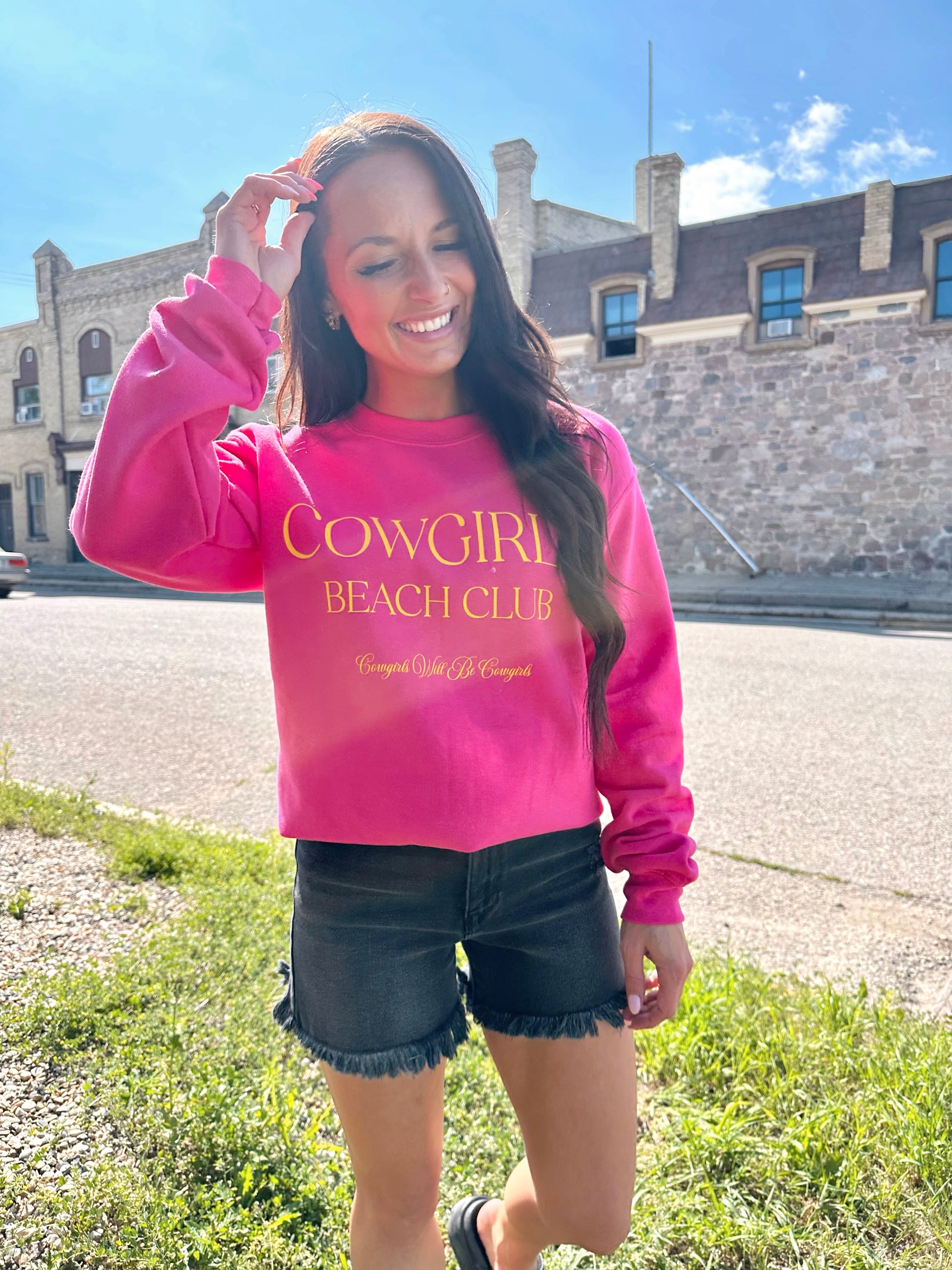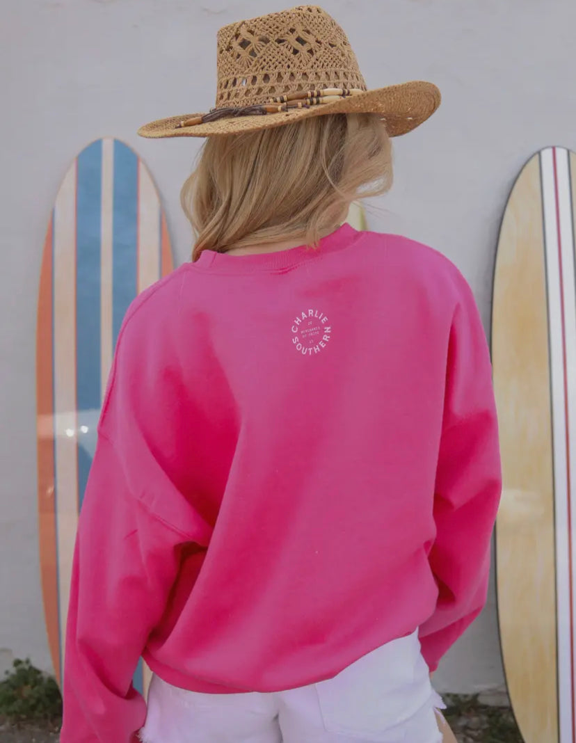 For the girls wishing they were horseback riding on the coast with an Apperol Spritz in hand- this one's for you! One of our favourite sweatshirts from this collection perfectly captures the coastal cowgirl vibe on a summer pink sweatshirt with lemon yellow text.