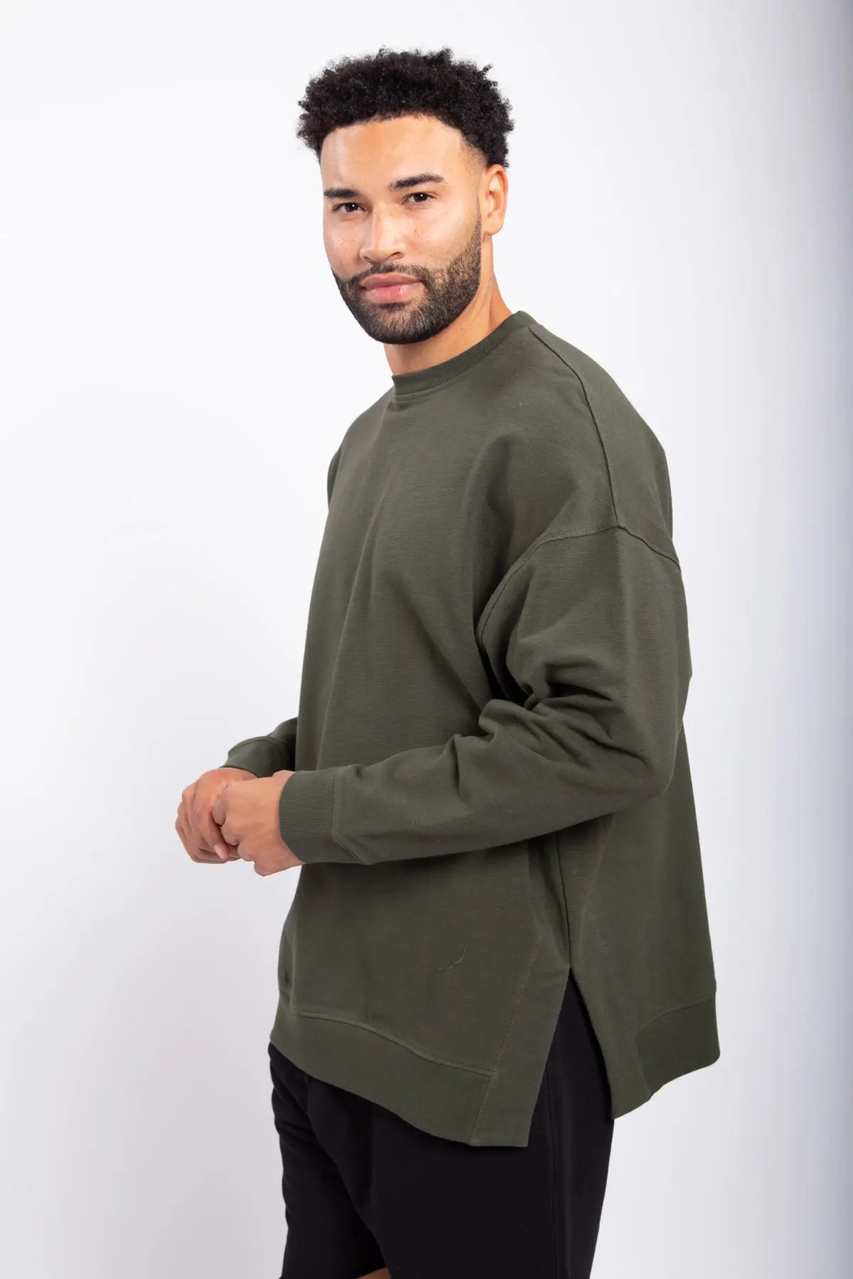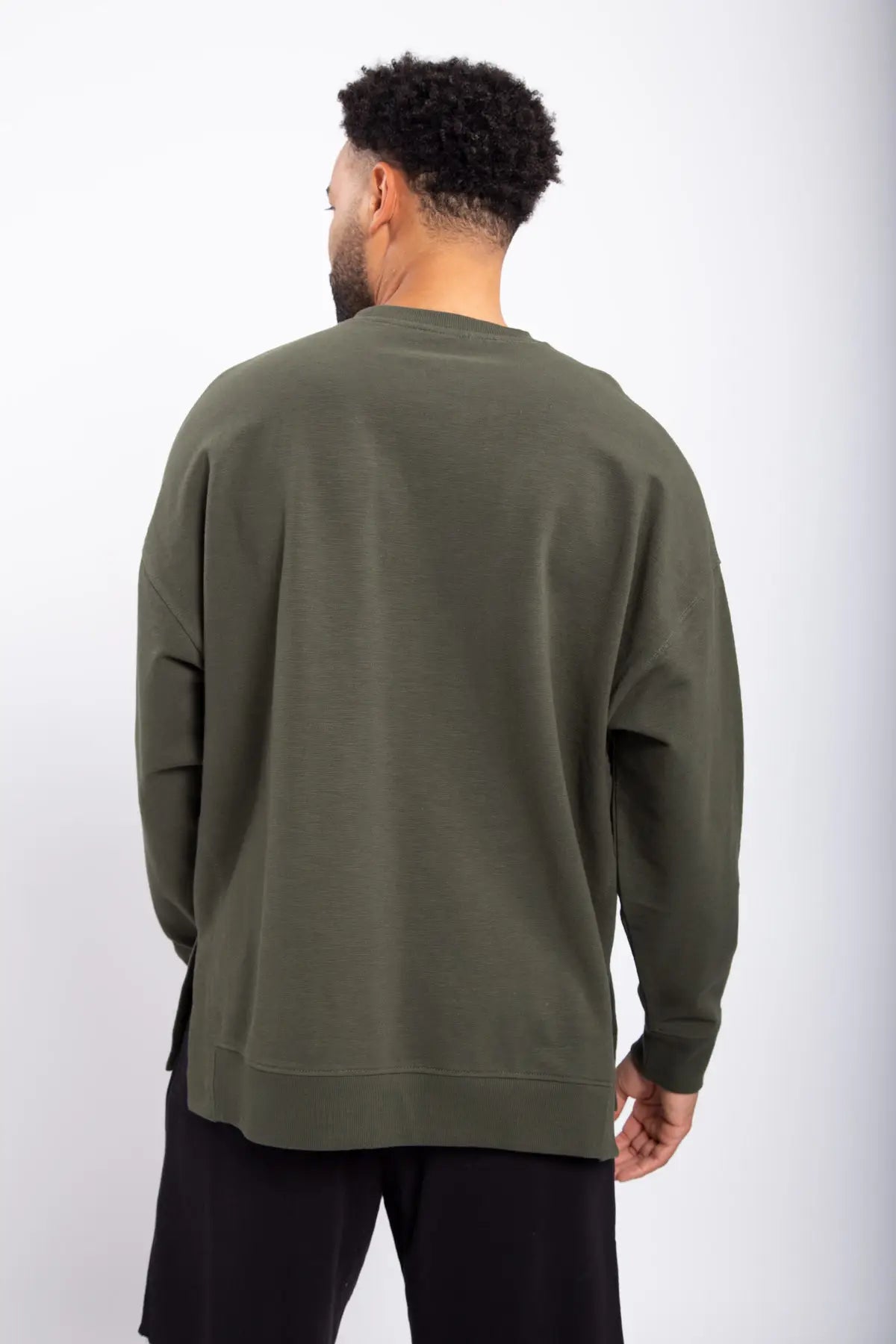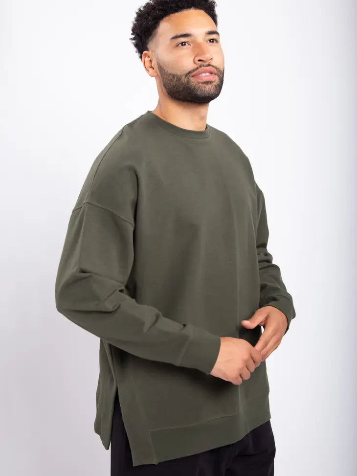 Classic crew neck pullover with a ribbed hem, cuffed long sleeves, and added movement by way of the side splits.