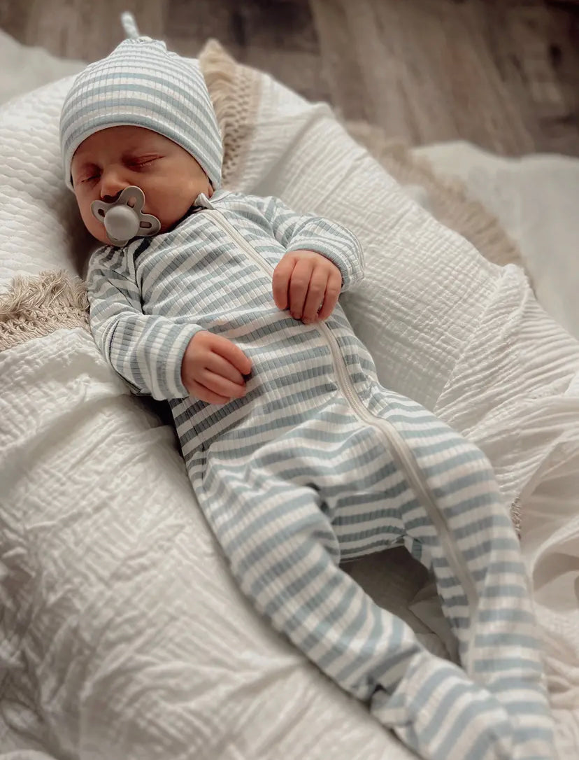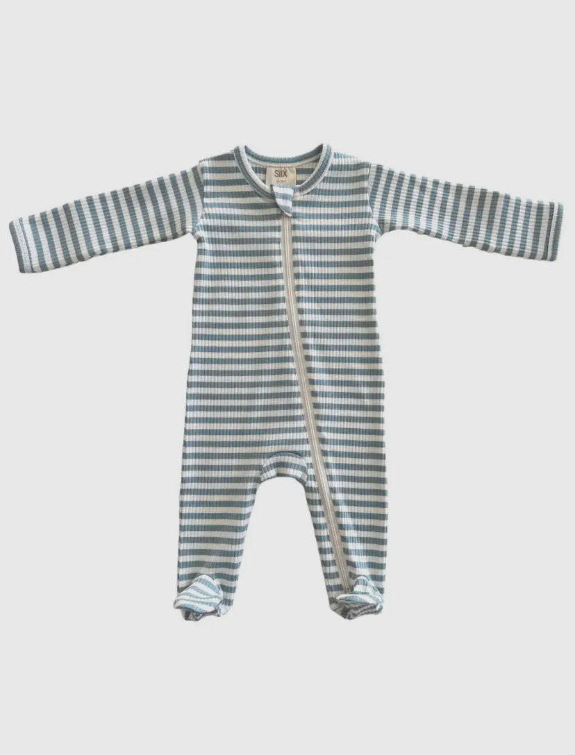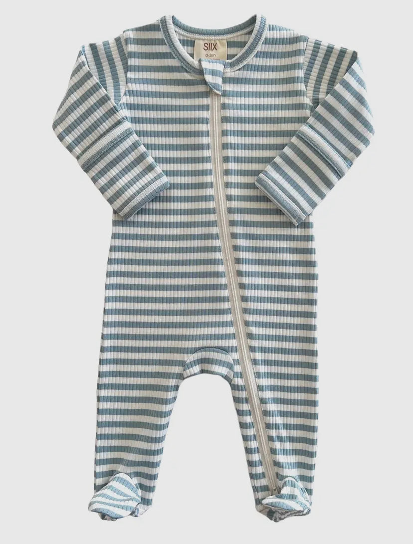 Dusty Blue Stripe Organic Ribbed Zip Onesie