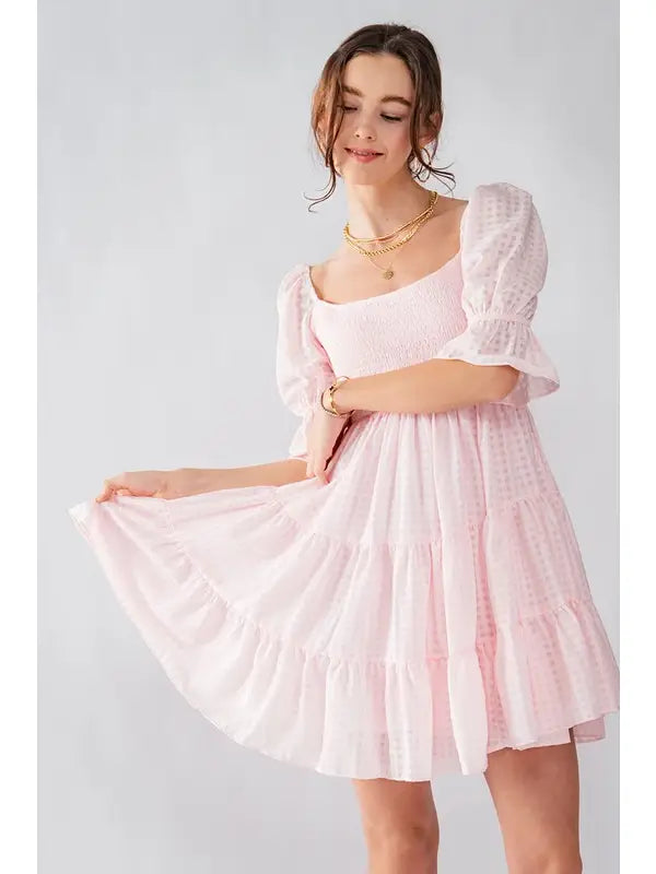 Gingham Pattern Smocked Tube Square Neck Puff Sleeve Tiered Mini Dress