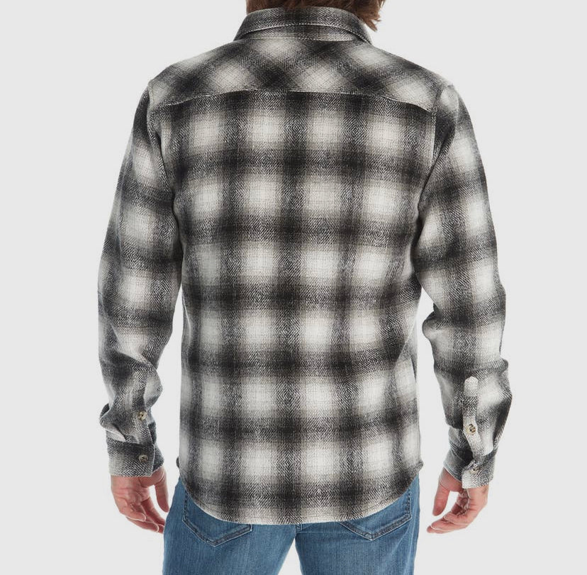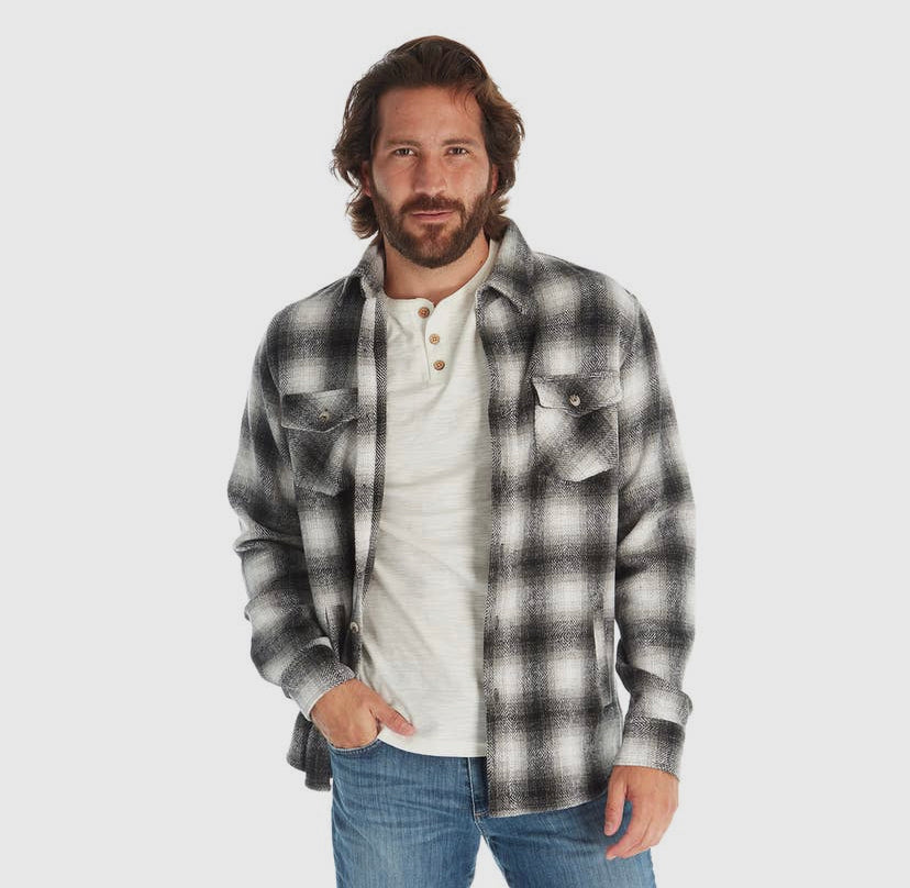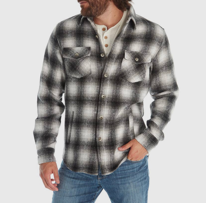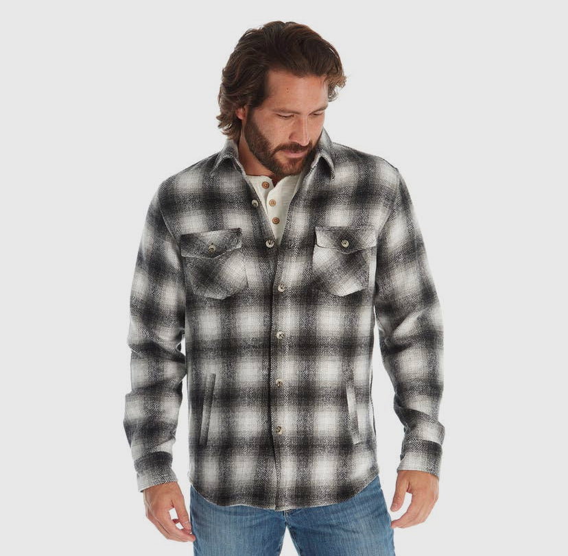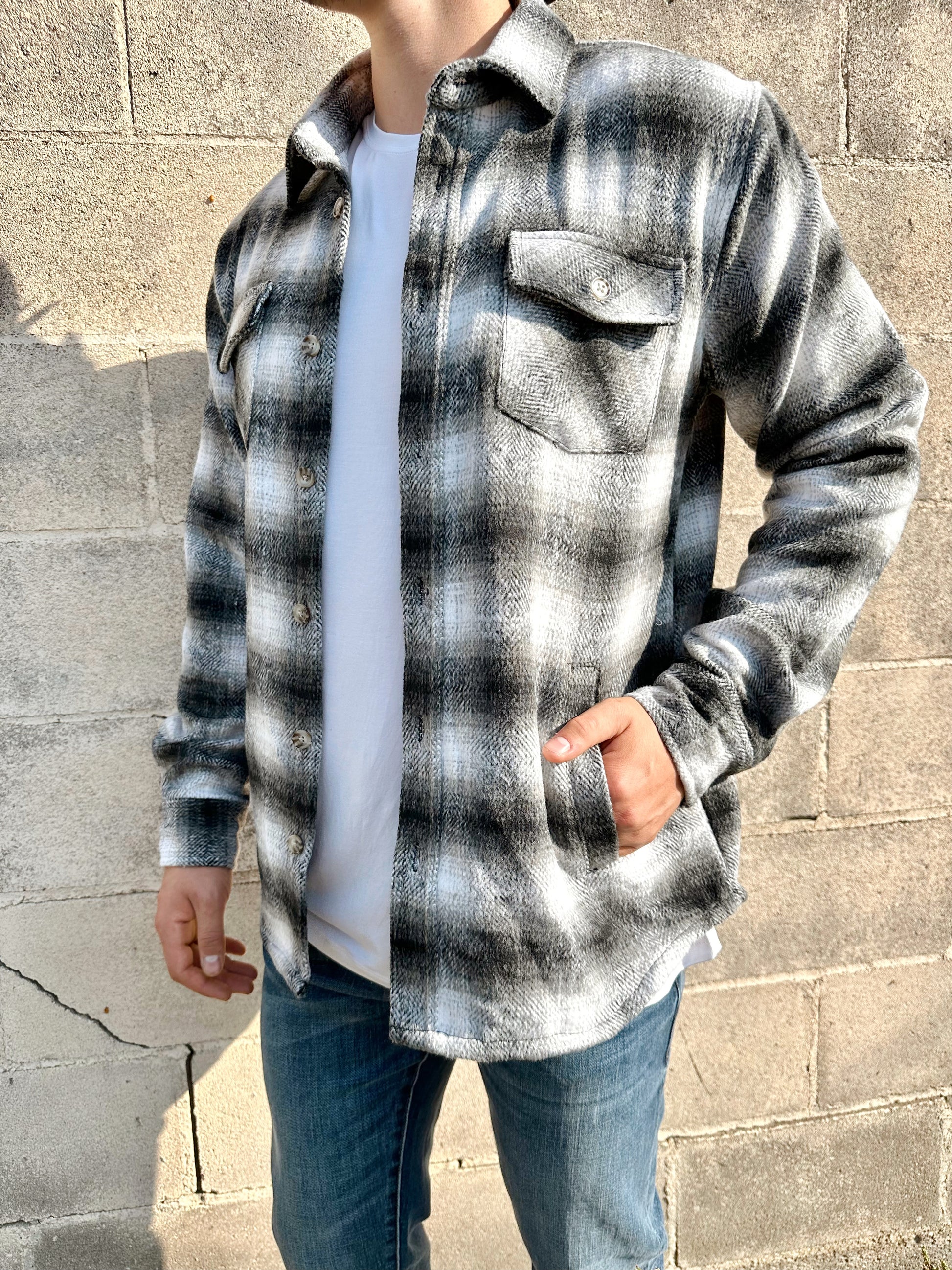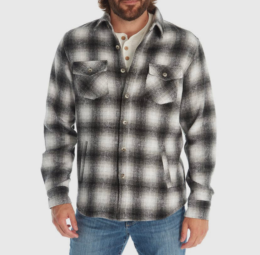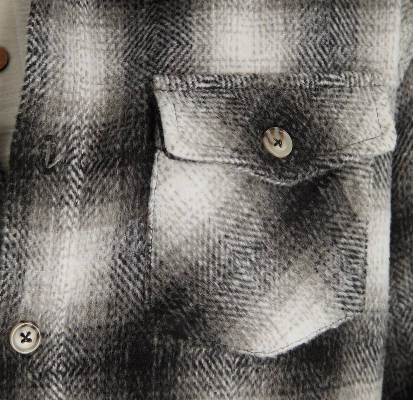 A layering heavy flannel shirt jacket with 2 patch pockets and 2 welt pockets.