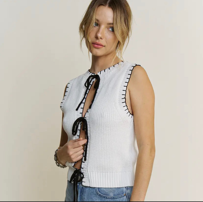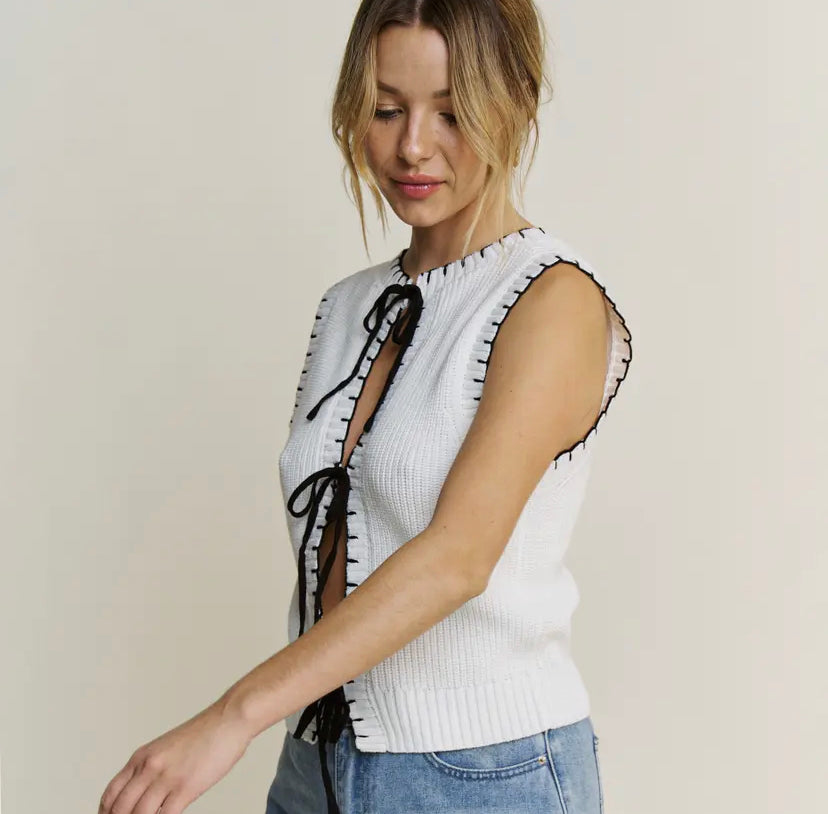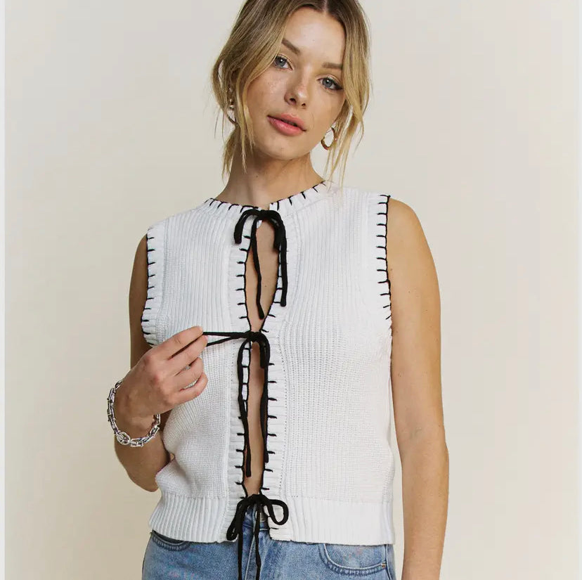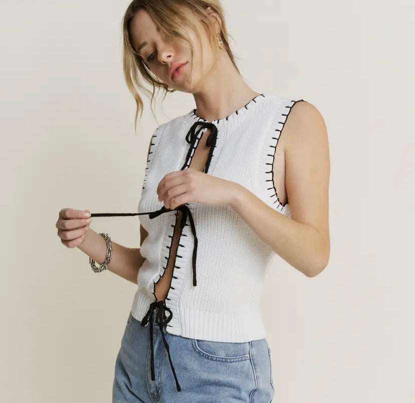 This knit vest is adorned with meticulous contrast stitching that adds a modern edge to a timeless silhouette. Whether layered over a crisp shirt for a polished look or paired with casual wear for a touch of elegance. Crafted from a soft, stretchy knit, - knit top with blanket stitch detail - Sleeveless - Slip-on closure - Self-tie bowknot at back - Knit fabric provides flexibility - Fit: Relaxed - back tie closure