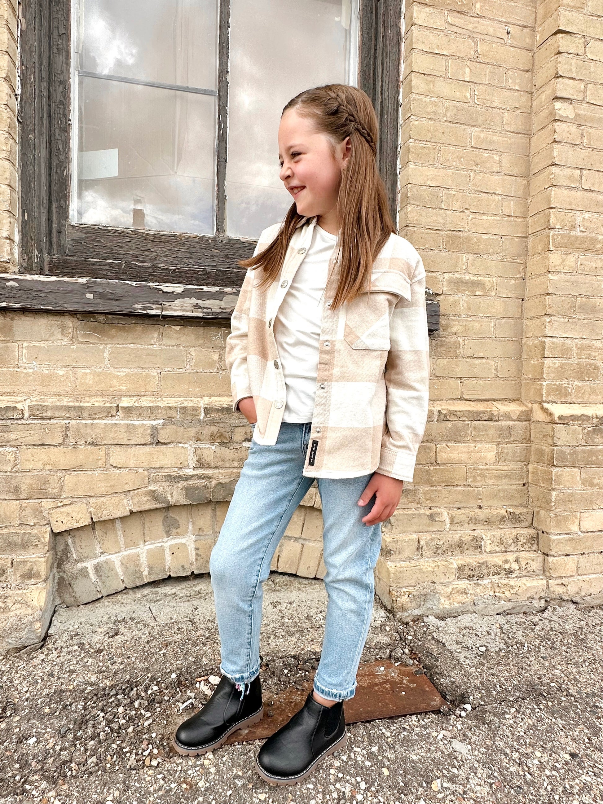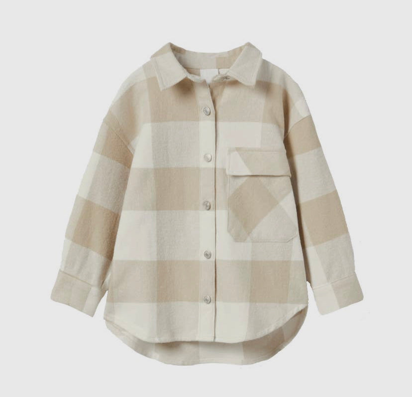 Yarn dye plaid long sleeve overshirt, featured by a single large chest pocket. Loose fit blouse made in a soft, warm, thick, heavyweight twill with a brushed finish.