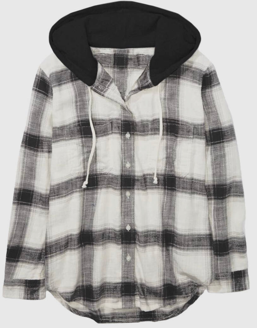 Hooded yarn dye plaid long sleeve shirt with 2 chest pockets. Made with soft flannel fabric that will keep you warm and cozy! Hood made in soft fleece fabric, sleeve tab and scoop hem. Loose fit.