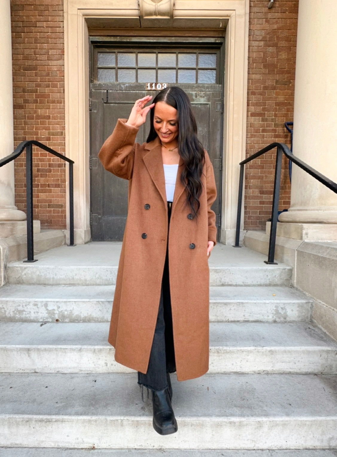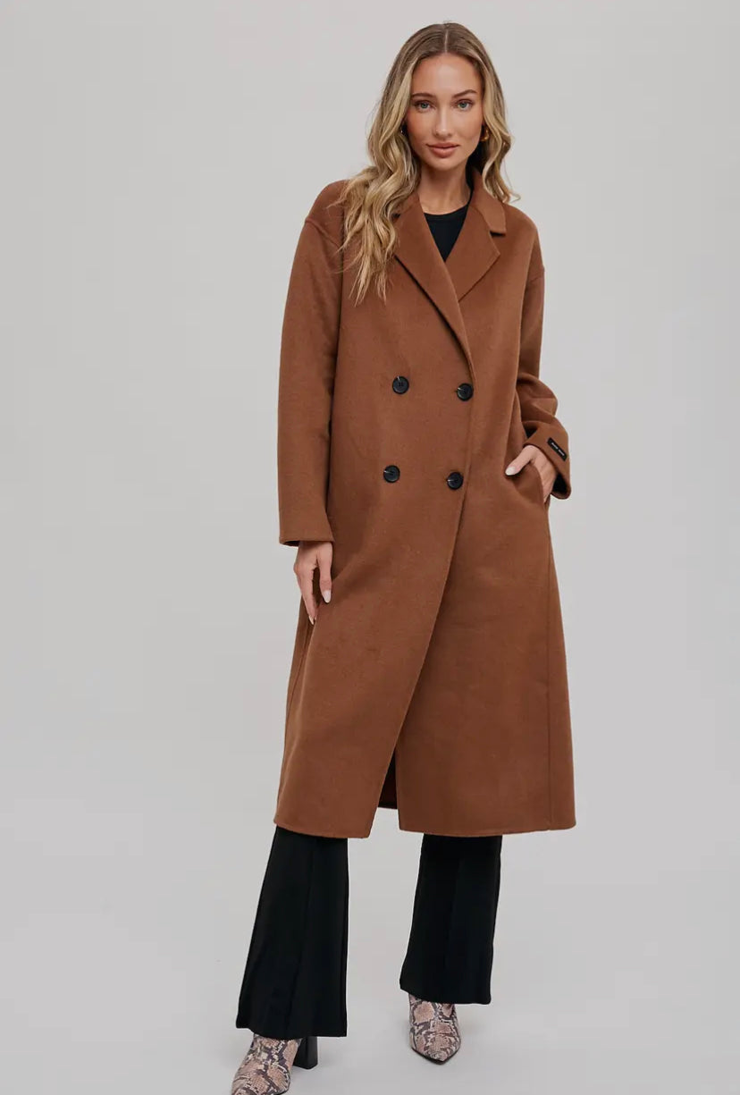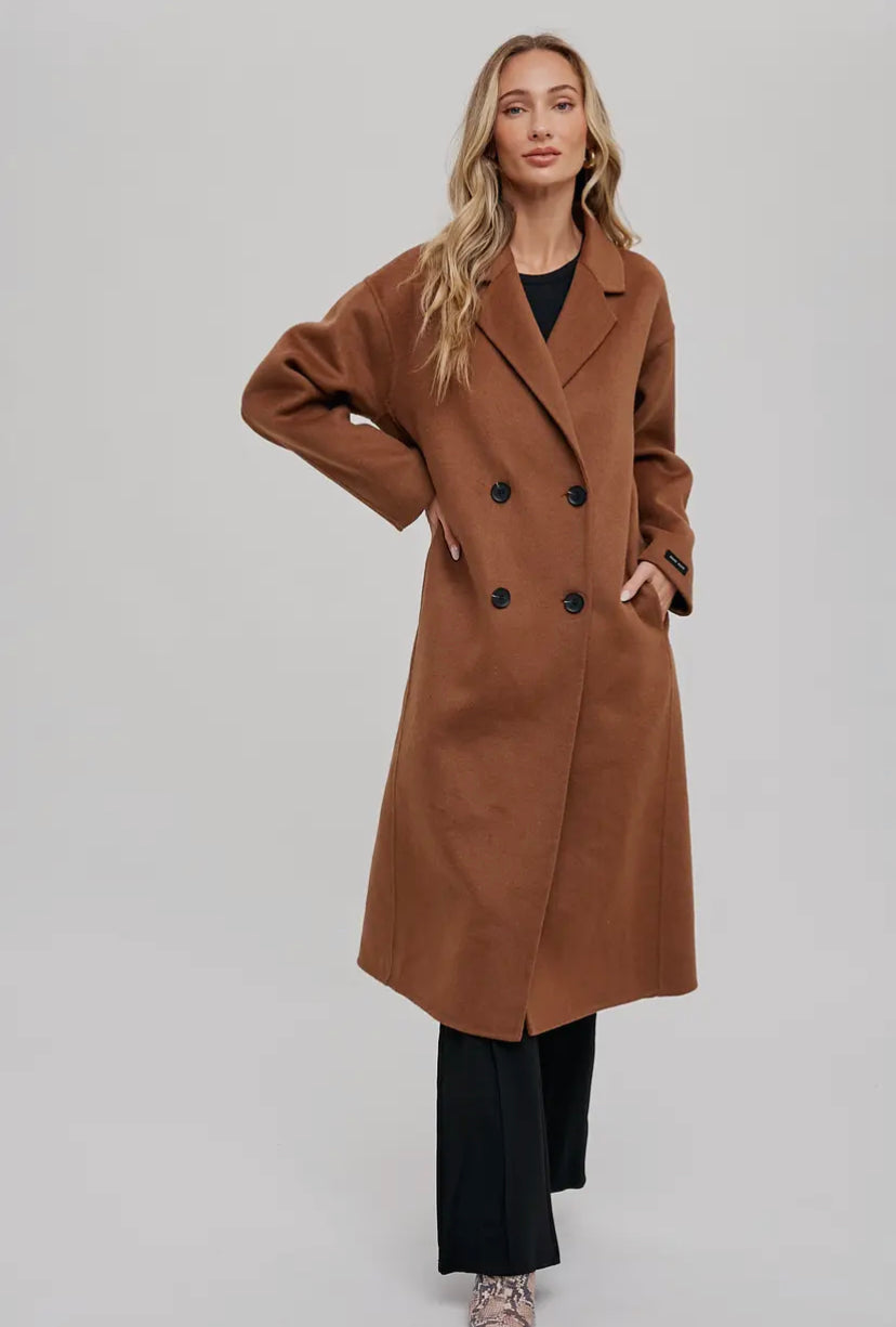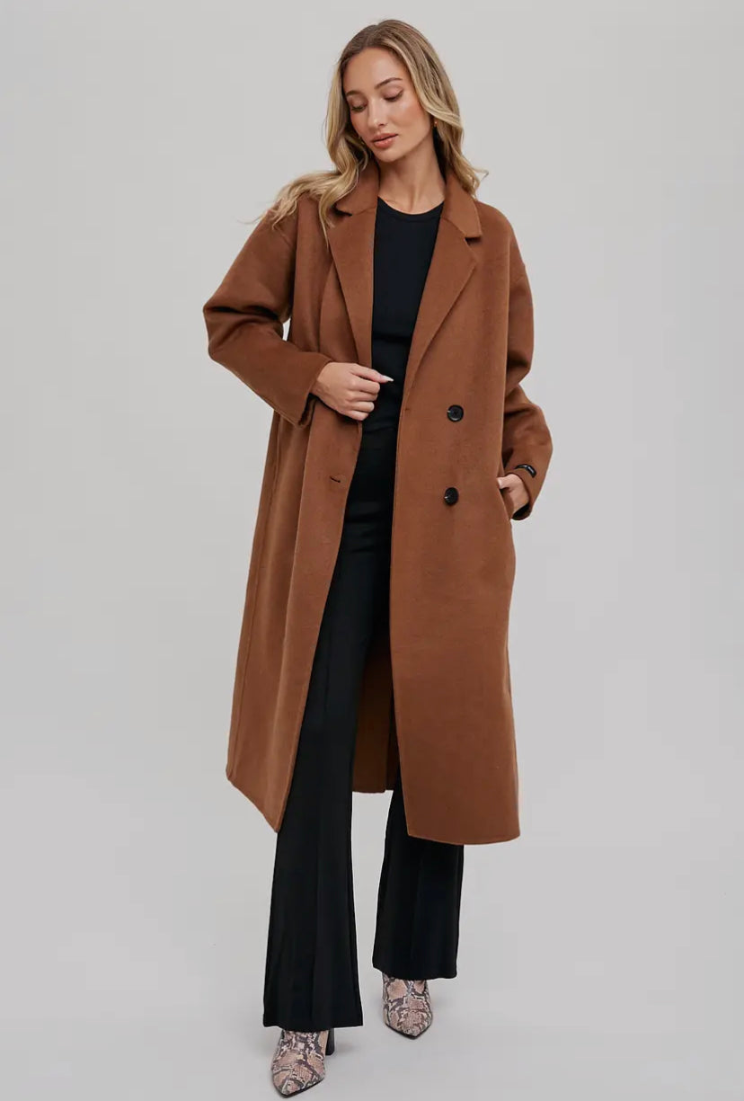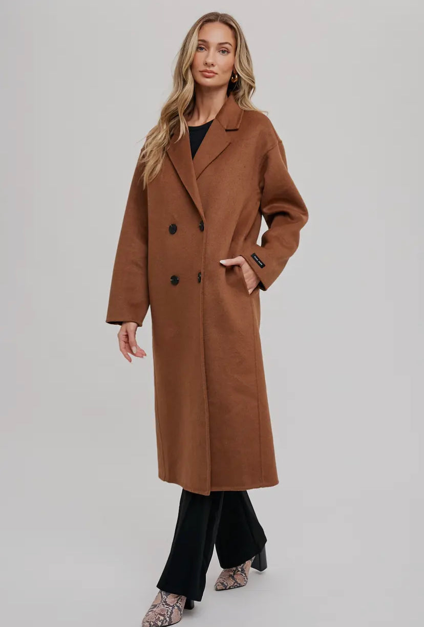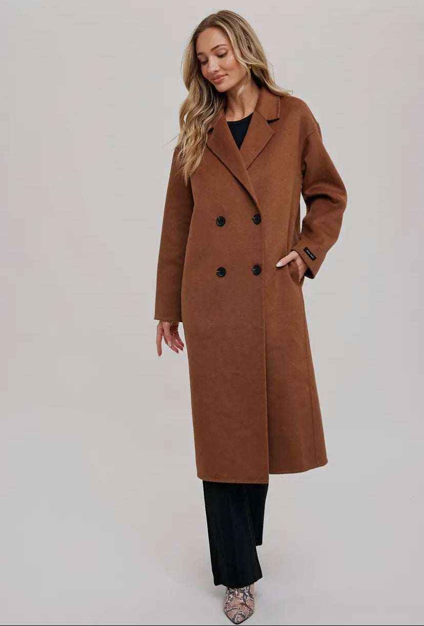Introducing a meticulously crafted, handmade double-breasted longline coat that embodies timeless elegance and sophisticated style. This exquisite coat features a classic double-breasted front with a notched lapel, showcasing meticulous attention to detail and a refined aesthetic. The inclusion of side pockets enhances both functionality and fashion, providing a convenient place to keep your hands warm or store small essentials.