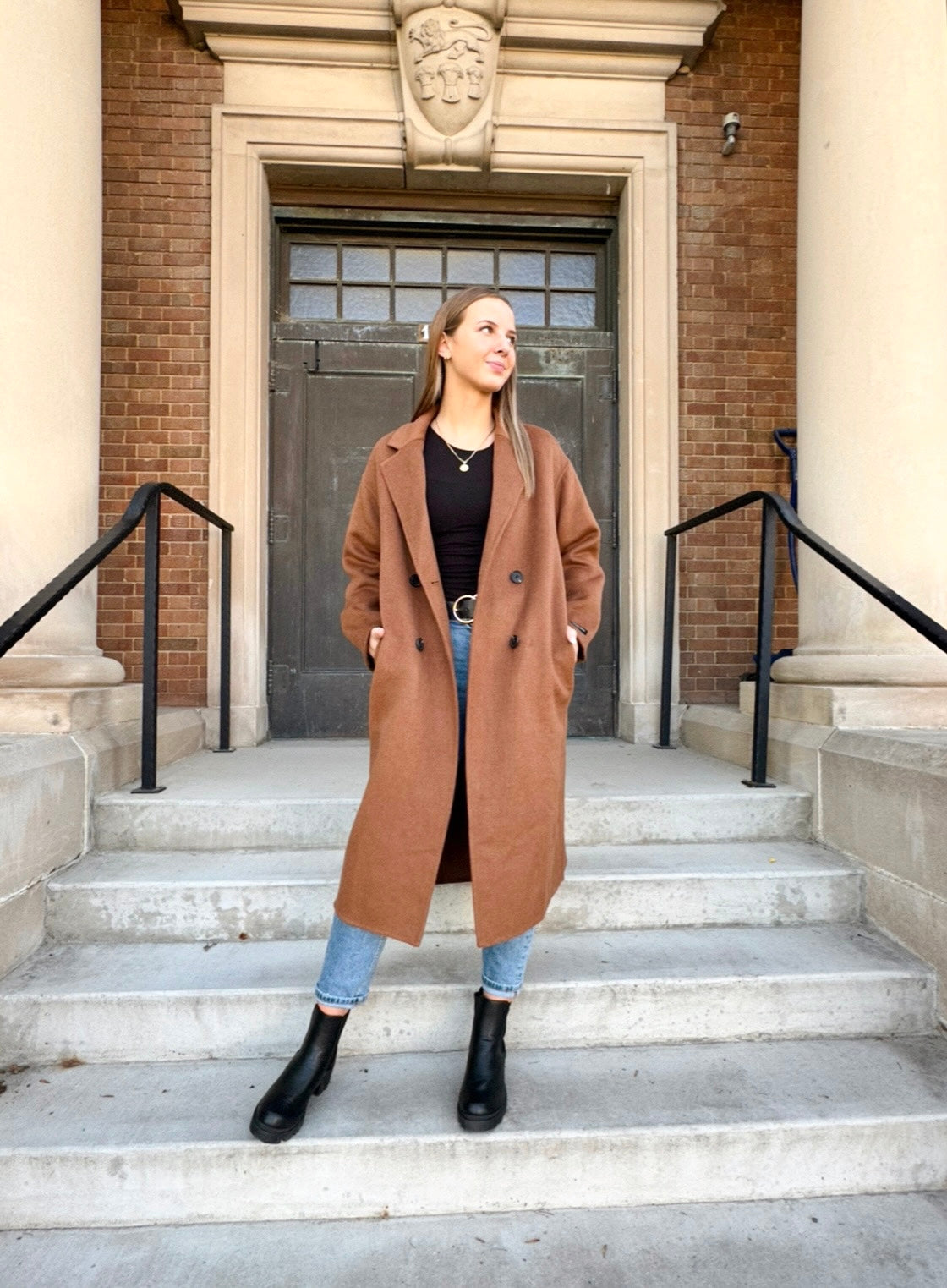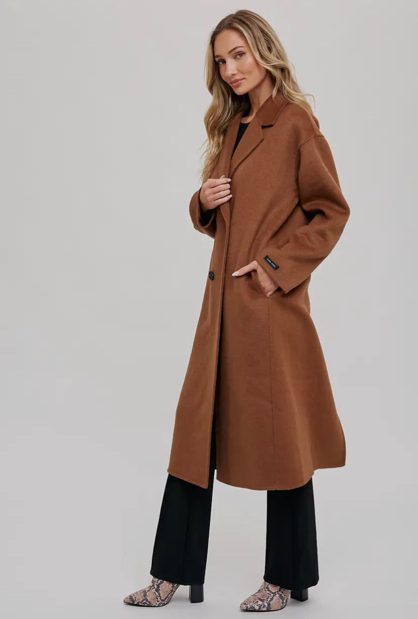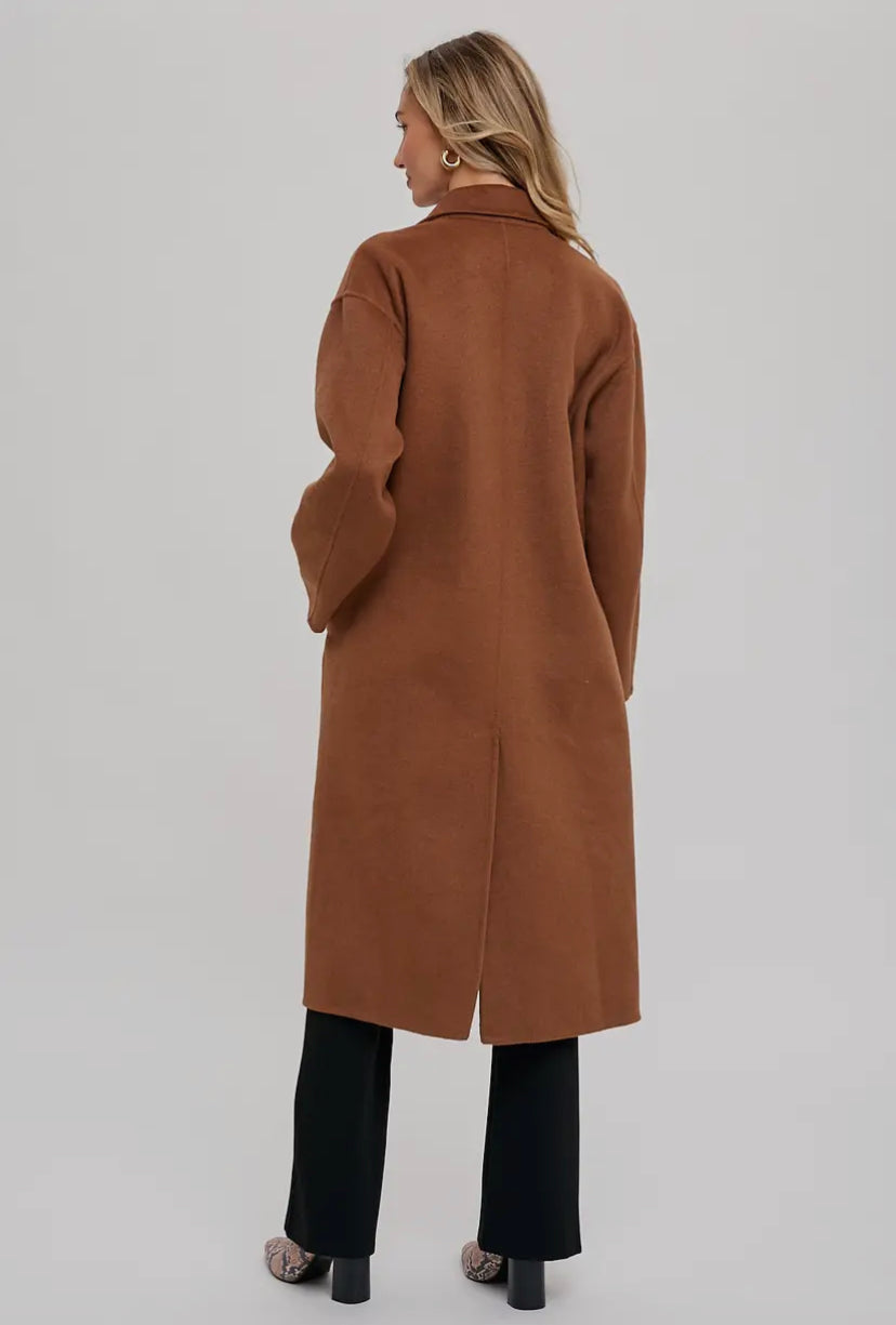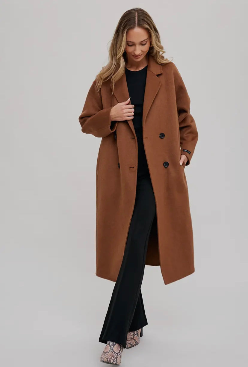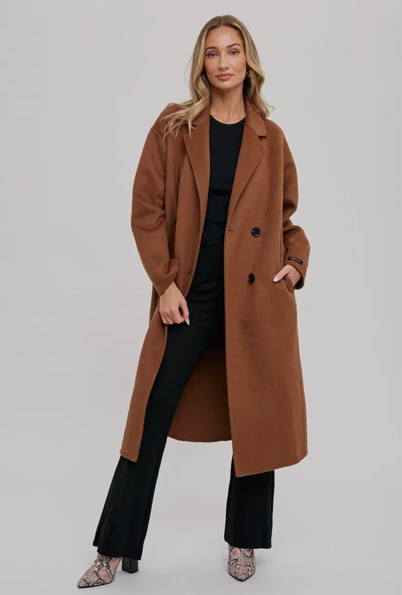 Introducing a meticulously crafted, handmade double-breasted longline coat that embodies timeless elegance and sophisticated style. This exquisite coat features a classic double-breasted front with a notched lapel, showcasing meticulous attention to detail and a refined aesthetic. The inclusion of side pockets enhances both functionality and fashion, providing a convenient place to keep your hands warm or store small essentials.