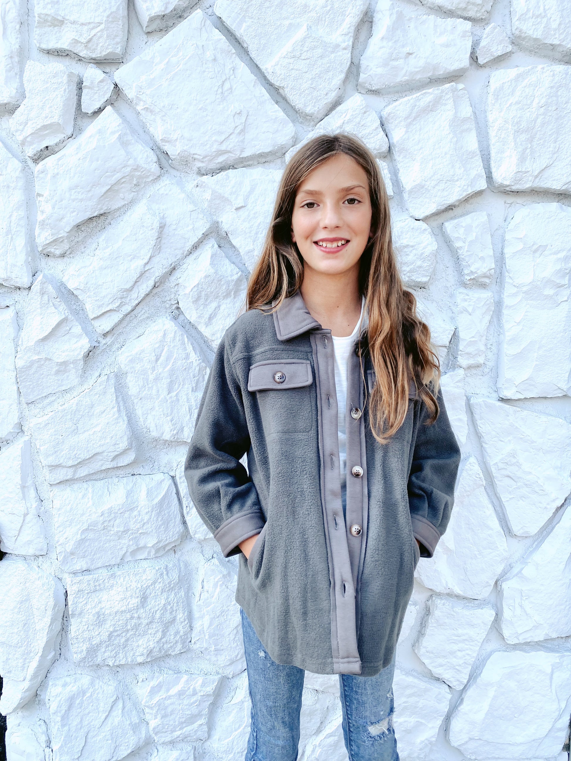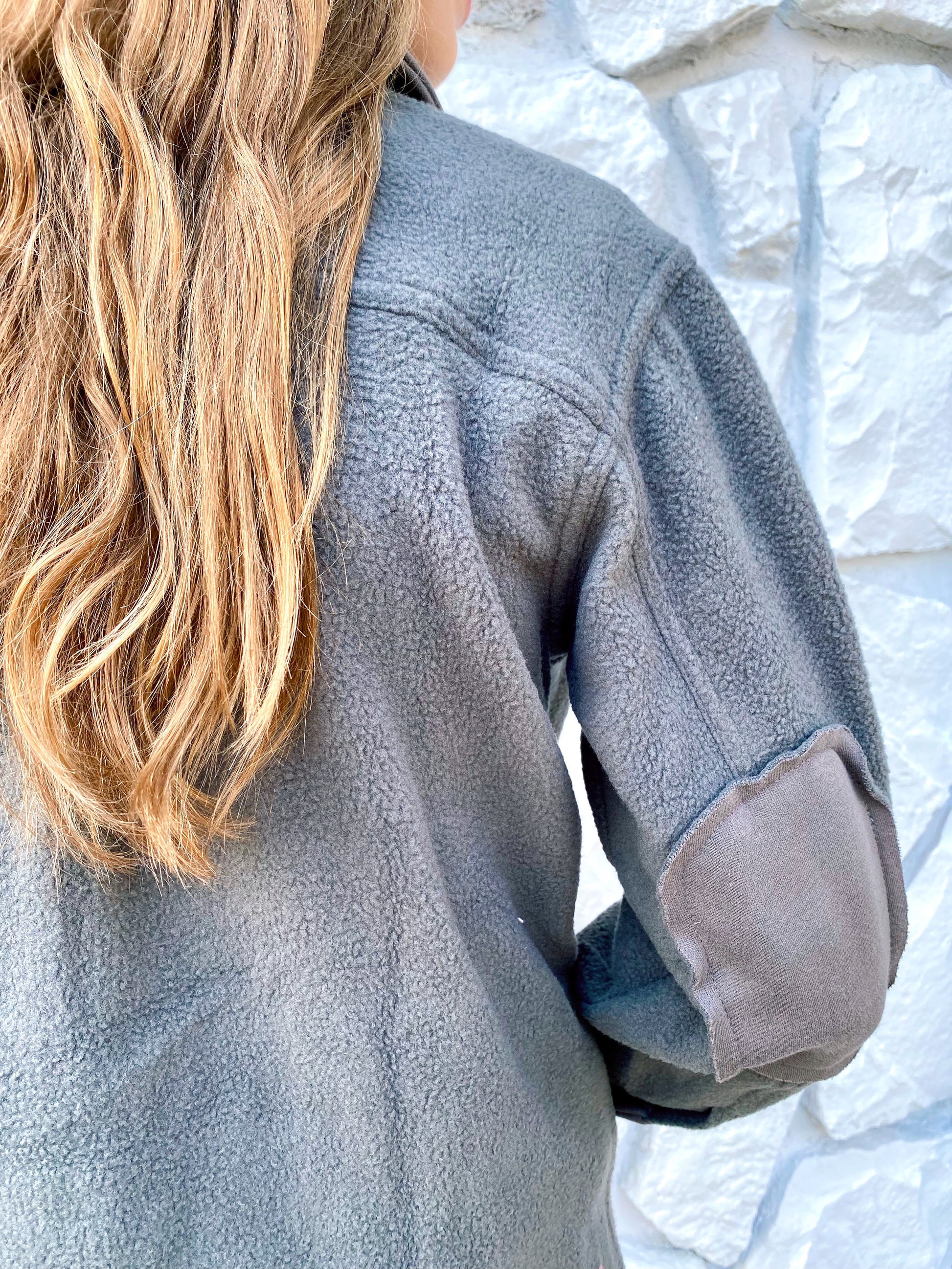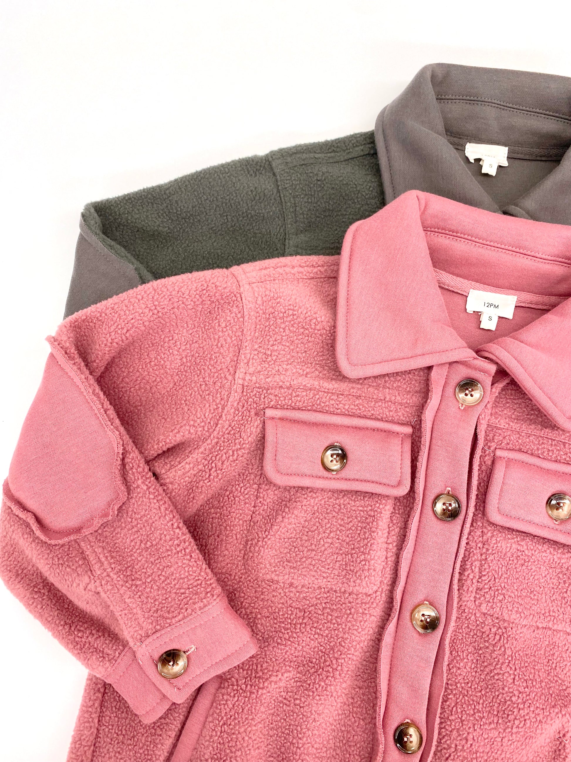 Button front, a boxy sherpa jacket with exaggerated pockets and contrast elbow detailing