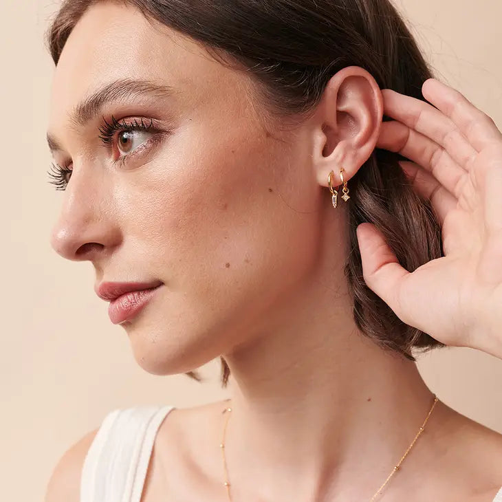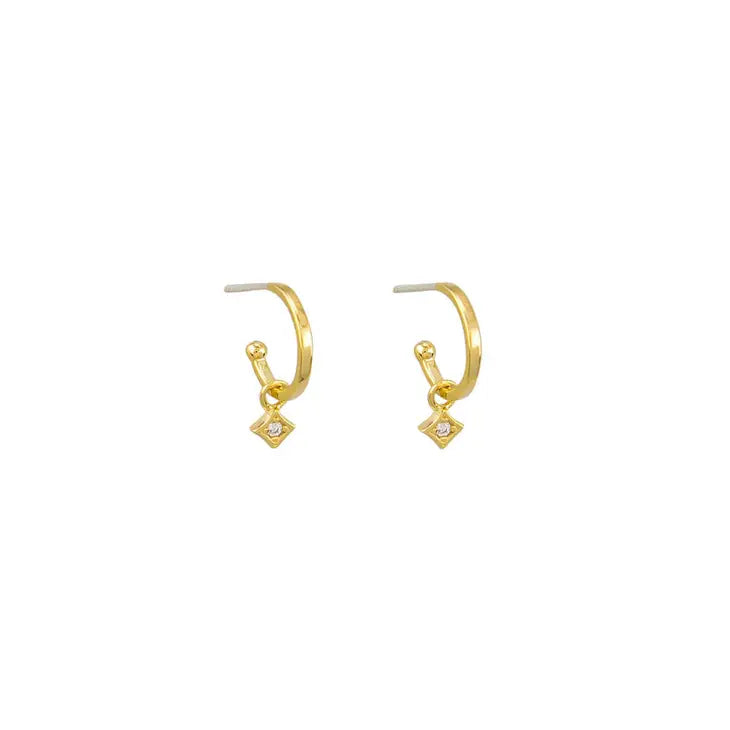 DESCRIPTION: The Jade Sleepers are a small huggie style with a hanging crystal diamond shaped charm. Made from a brass base with gold/silver plating. A delicate simple sleeper for stacking.
