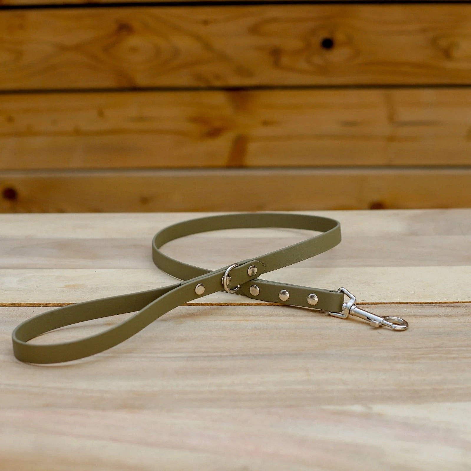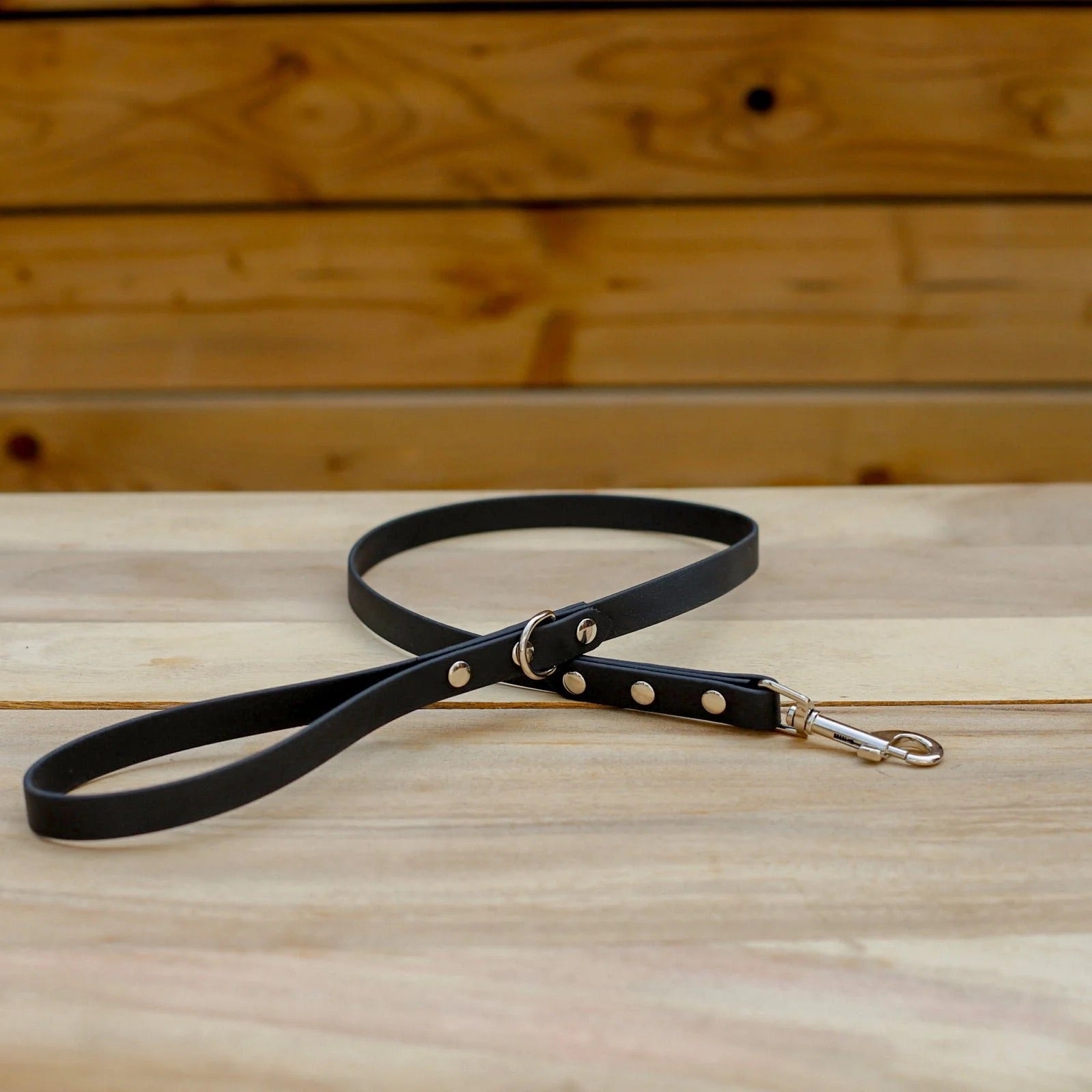 5/8” Biothane available in 3ft length with nickel or matte black metal hardware. This leash also features a D-ring - perfect to attach your poop bags or keys to!