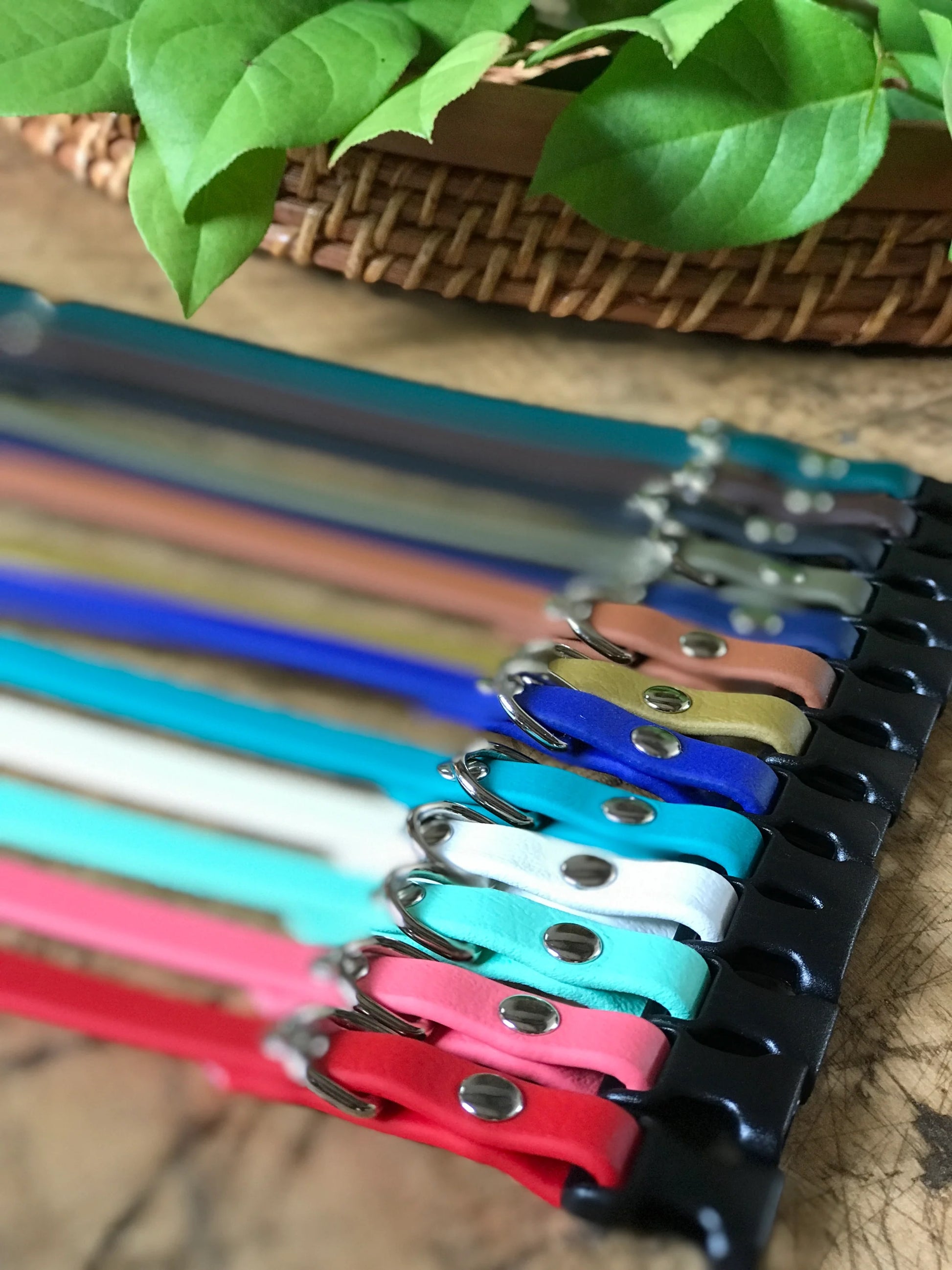 Biothane is a polymer coated webbing that is cleanable, durable, waterproof, stink proof and stain resistant. Biothane is an extremely durable material that has a soft flexible feel of broken in leather and will stand up to all crazy adventures.