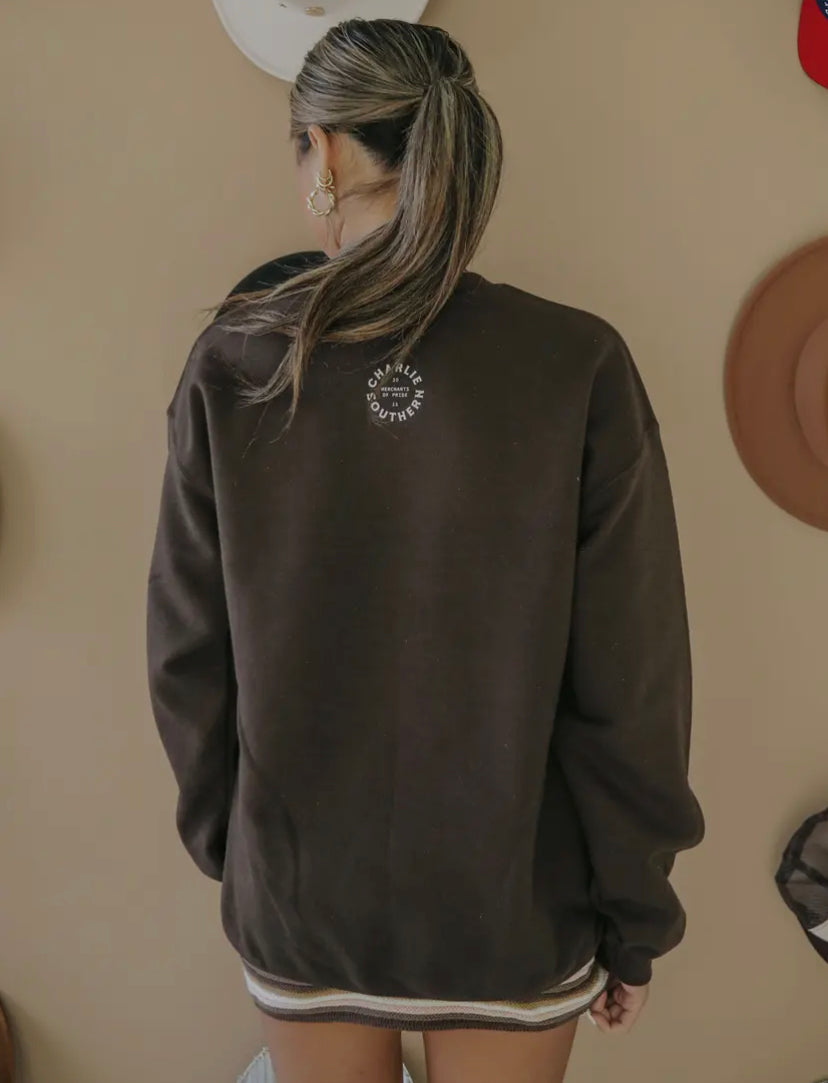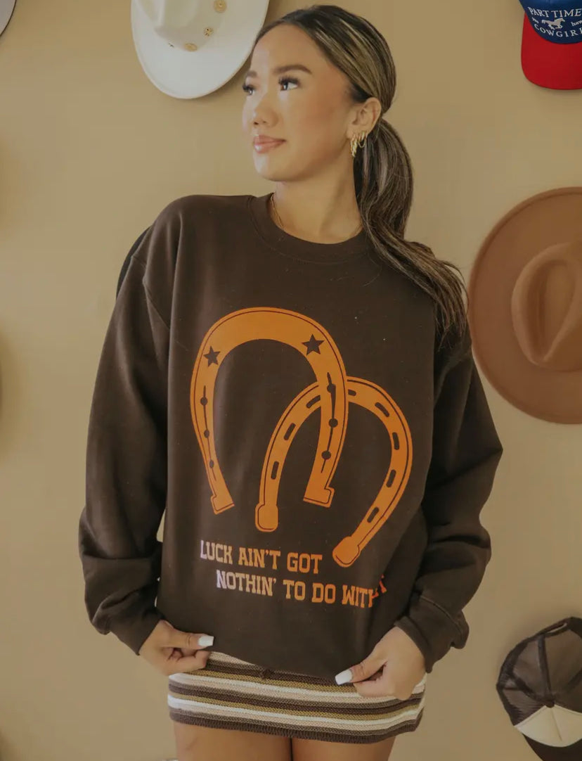 This western styled sweatshirt will bring you luck on any given honkytonk day! The ombre colored font on this chocolate colored blank is giving us the spring vibes that we need!
