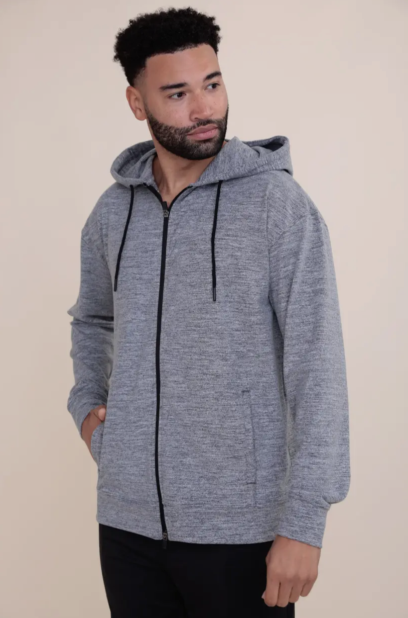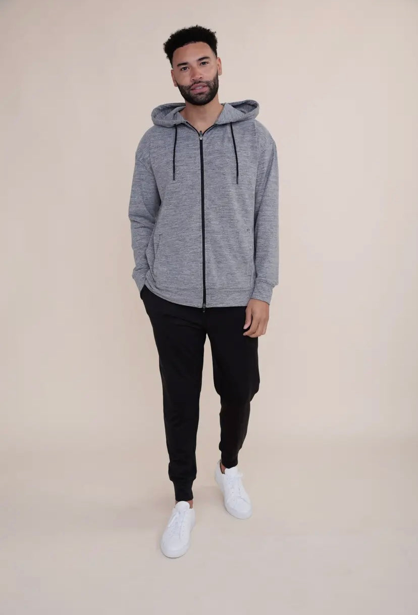This classic jacket silhouette comes in a melange material, has a hood with drawstring closure, and a double-ended zipper. Throw it on after a late-night gym sesh for practical and stylish coverage.