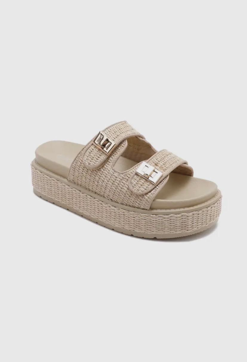 1 inch Platform Sandal with trendy Gold Buckles & Raffia Detail Throughout