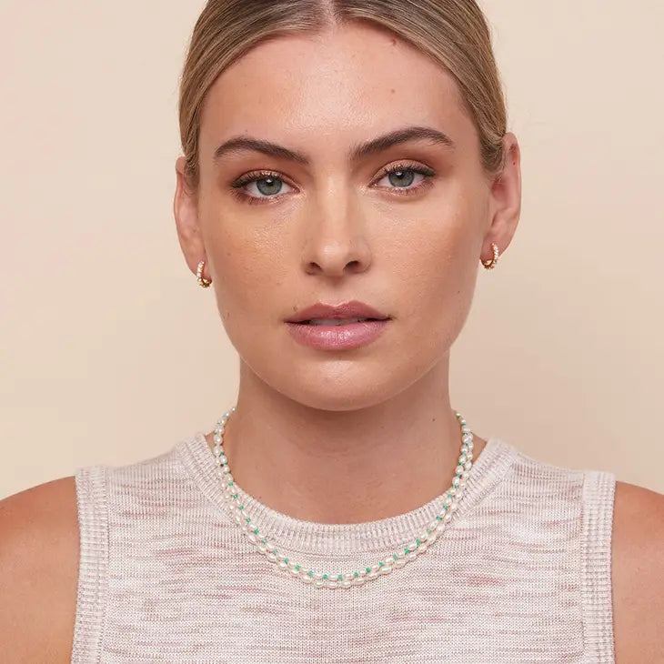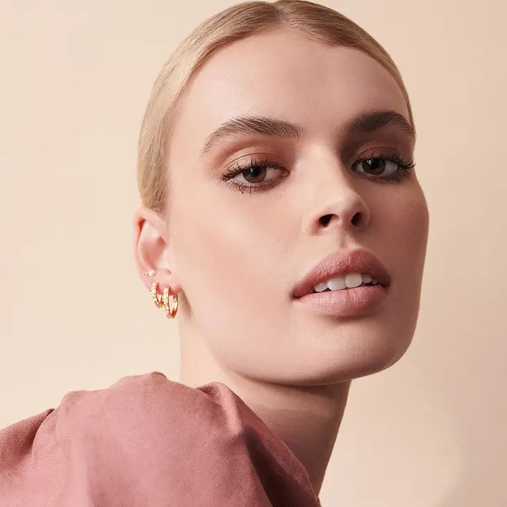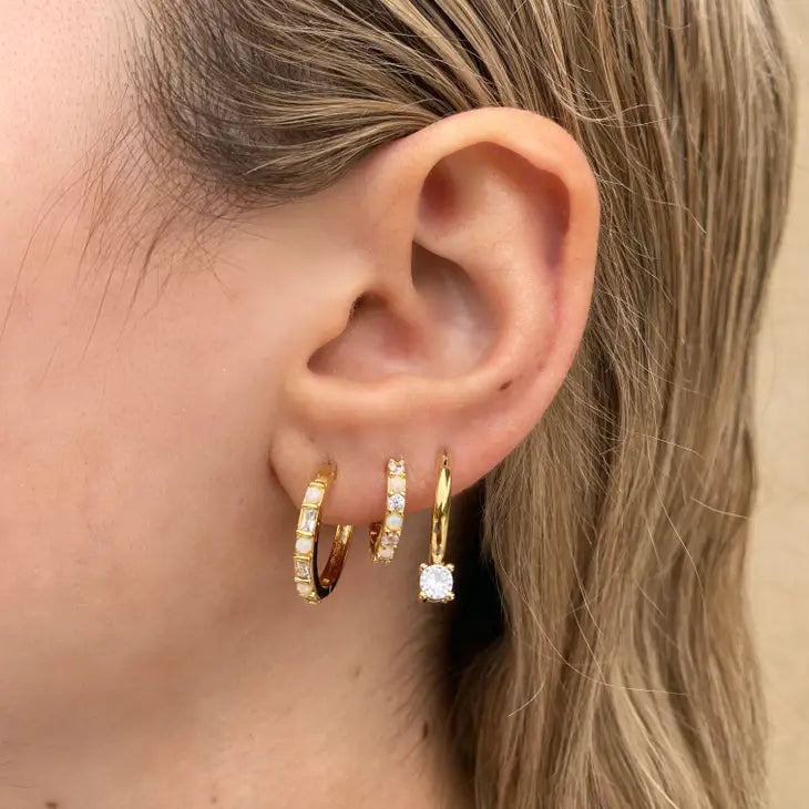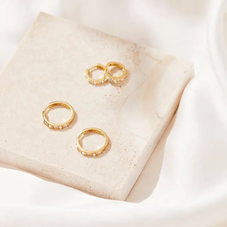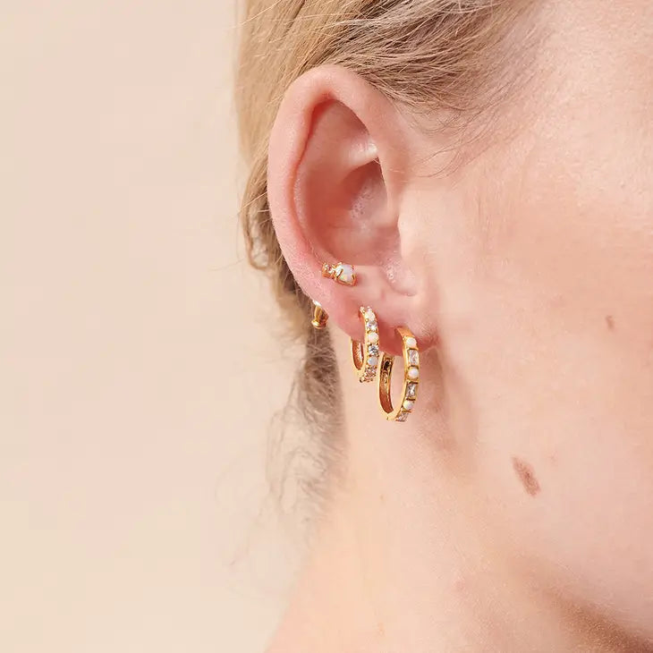 DESCRIPTION: The Olympia Opal & Crystal Sleepers are a classic sleeper shape with alternating faux opals and Swarovski crystals. A pretty style that you can layer with your favourite studs or hoops.