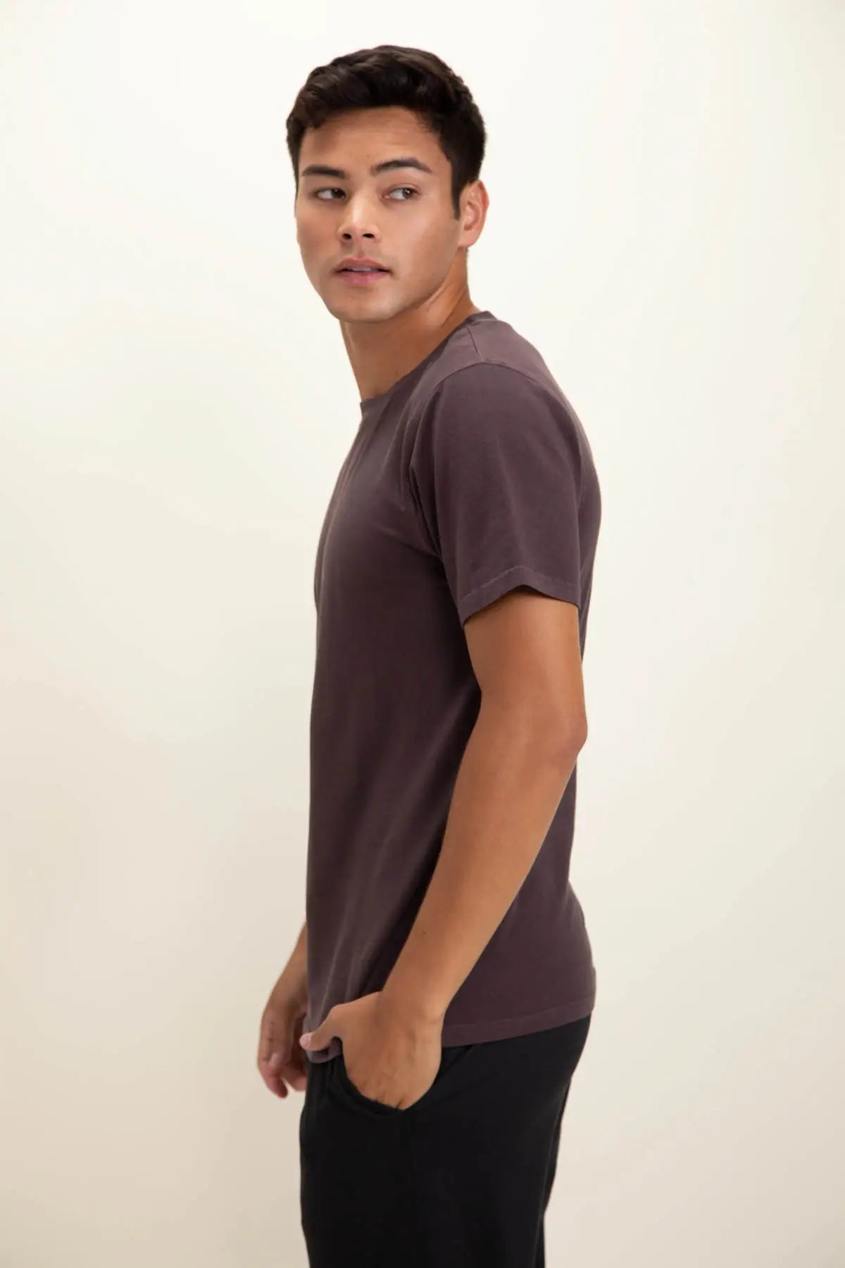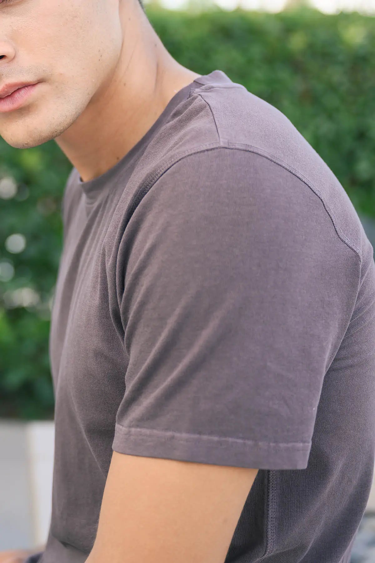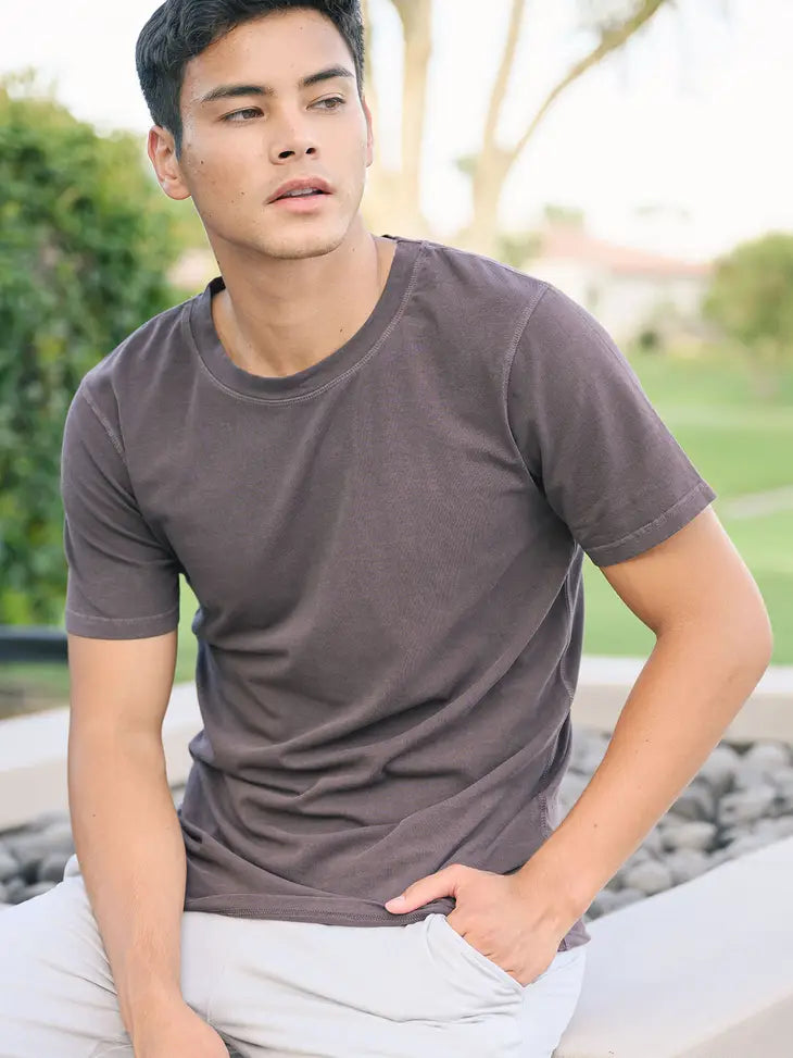 Stretchy and breathable (thanks to the pima cotton and spandex fibers), this t-shirt also features a round neckline, short sleeves, and topstitch across the neckline and the armhole.