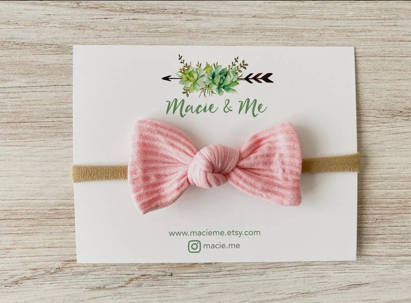 The perfect dainty bow for those new babies. This bow is on a nude nylon headband that stretches to fit all head sizes.