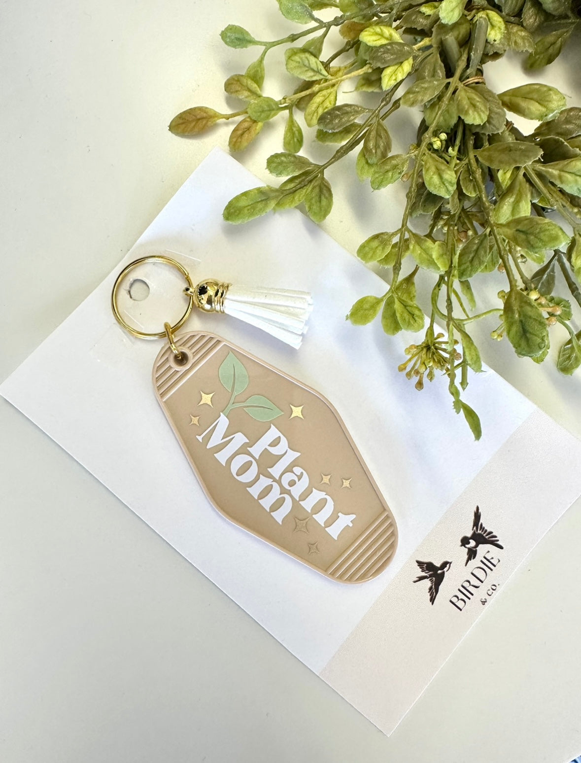 This keychain is the perfect accessory for your keys. This retro-style motel keychain features the phrase "Plant Momkey". It's a simple, stylish accessory that adds a touch of fun to any set of keys!