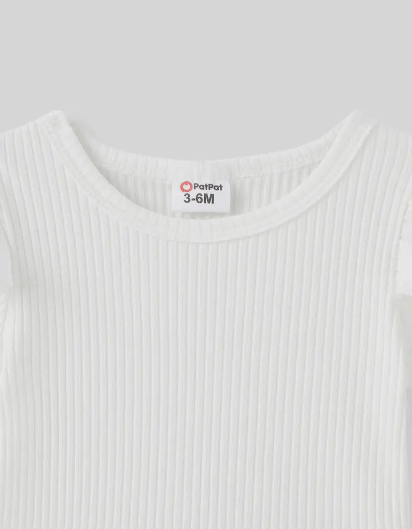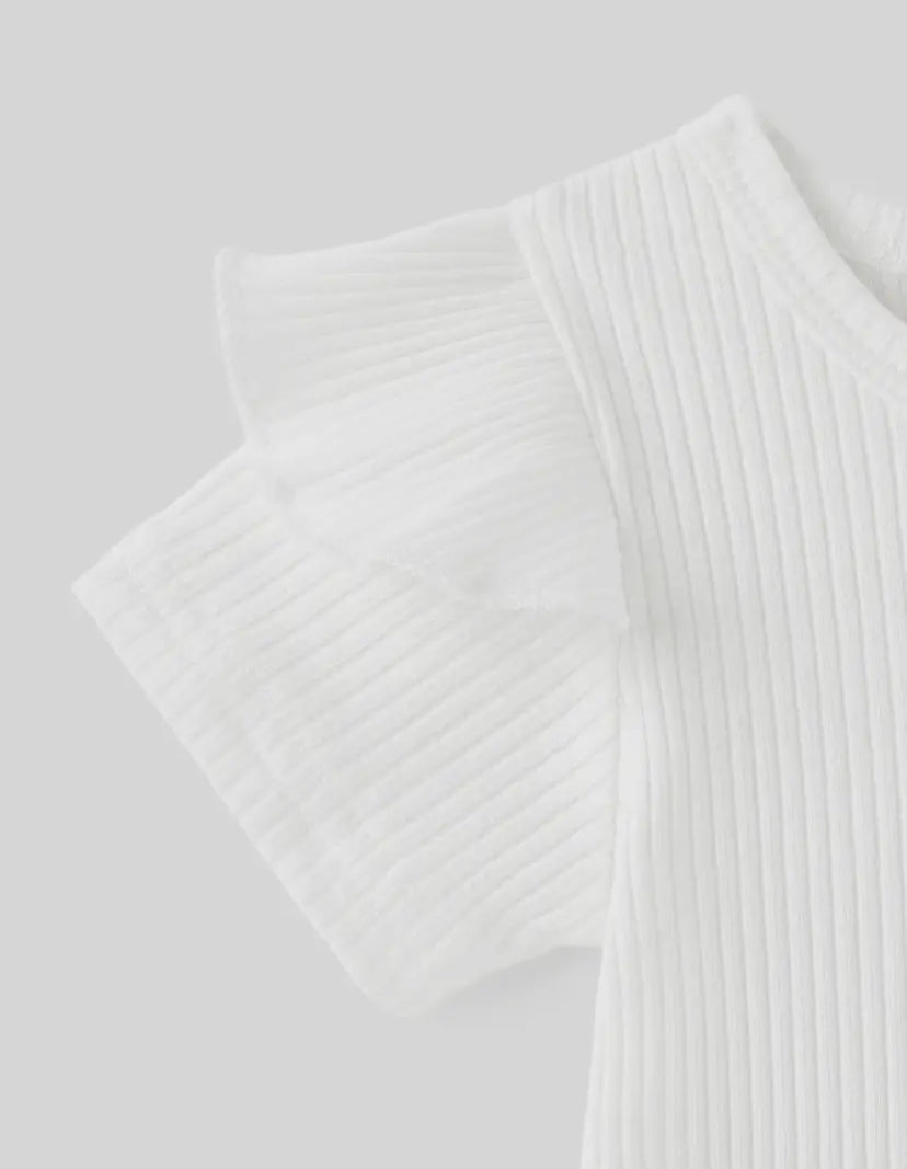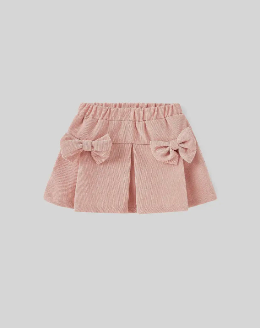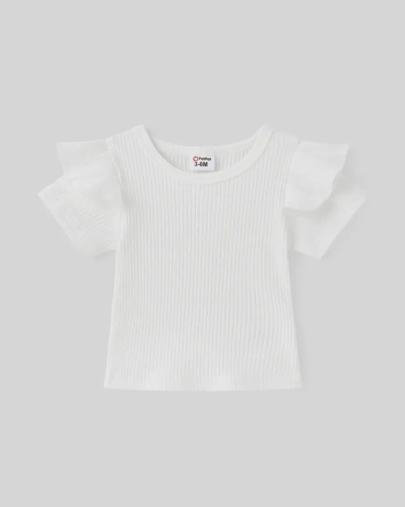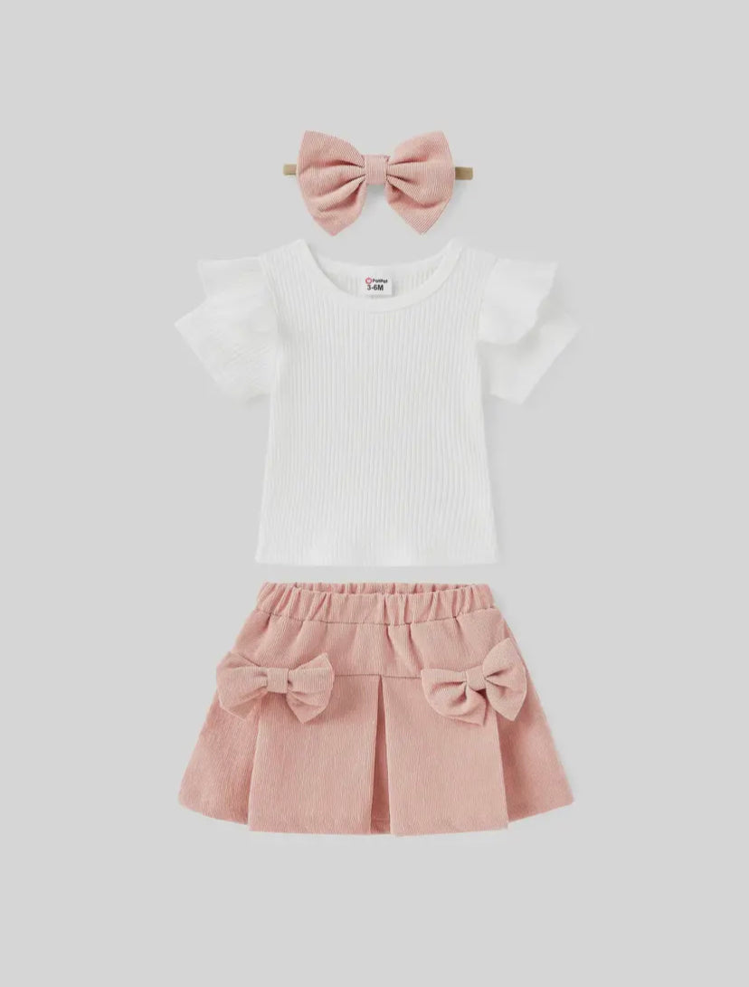 Adorable ruffle short-sleeve tee and bow front skirt with headband.