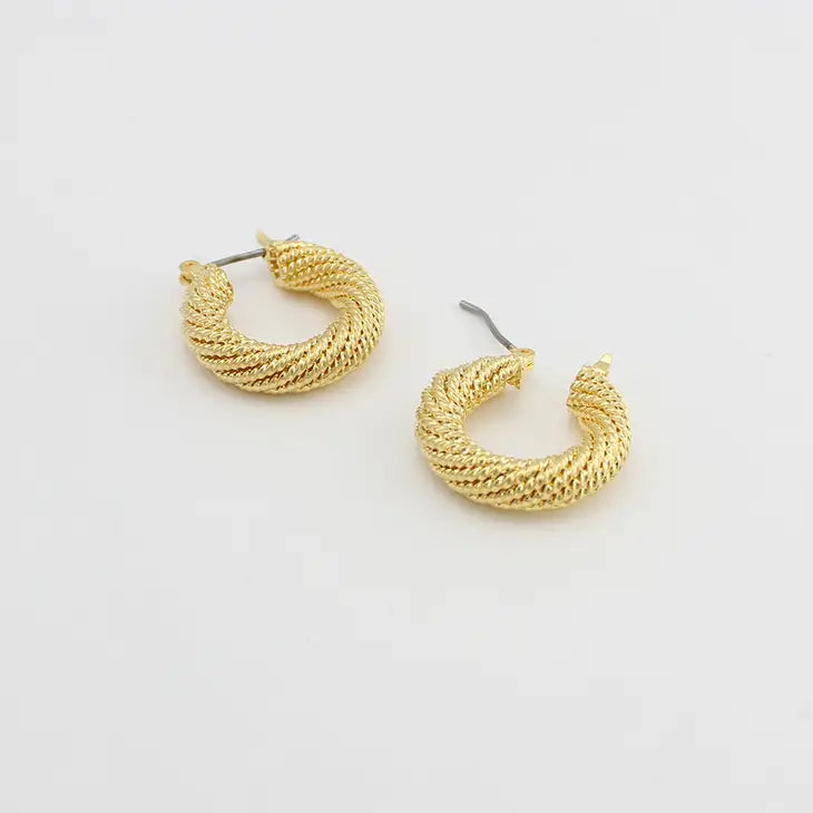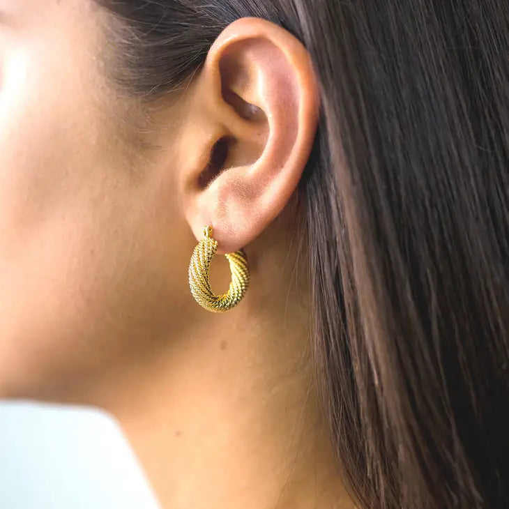 A small style hoop with twisted rope detail. In high quality thick plating of gold or silver.