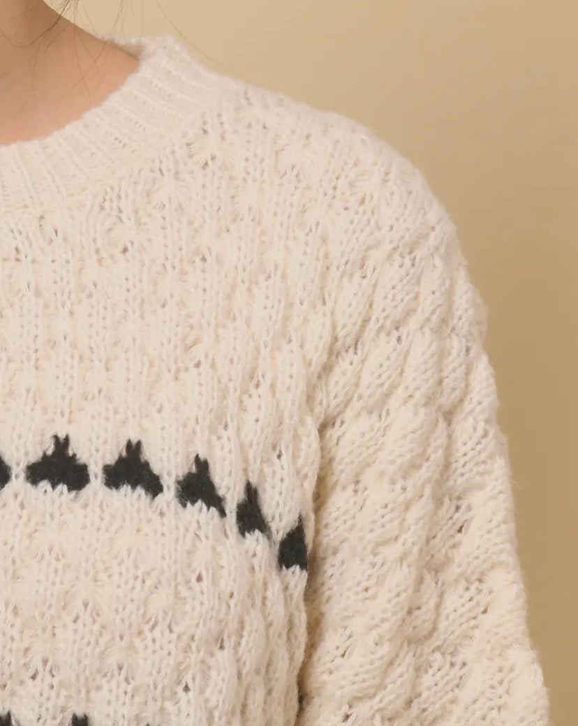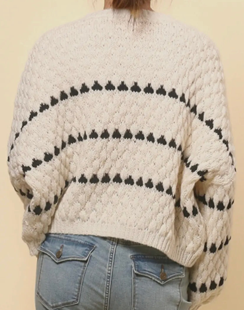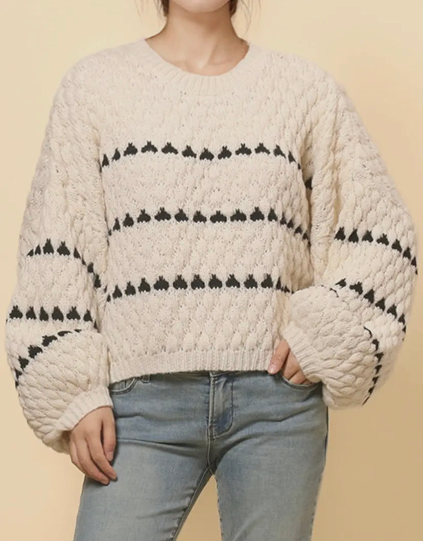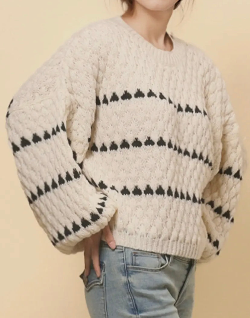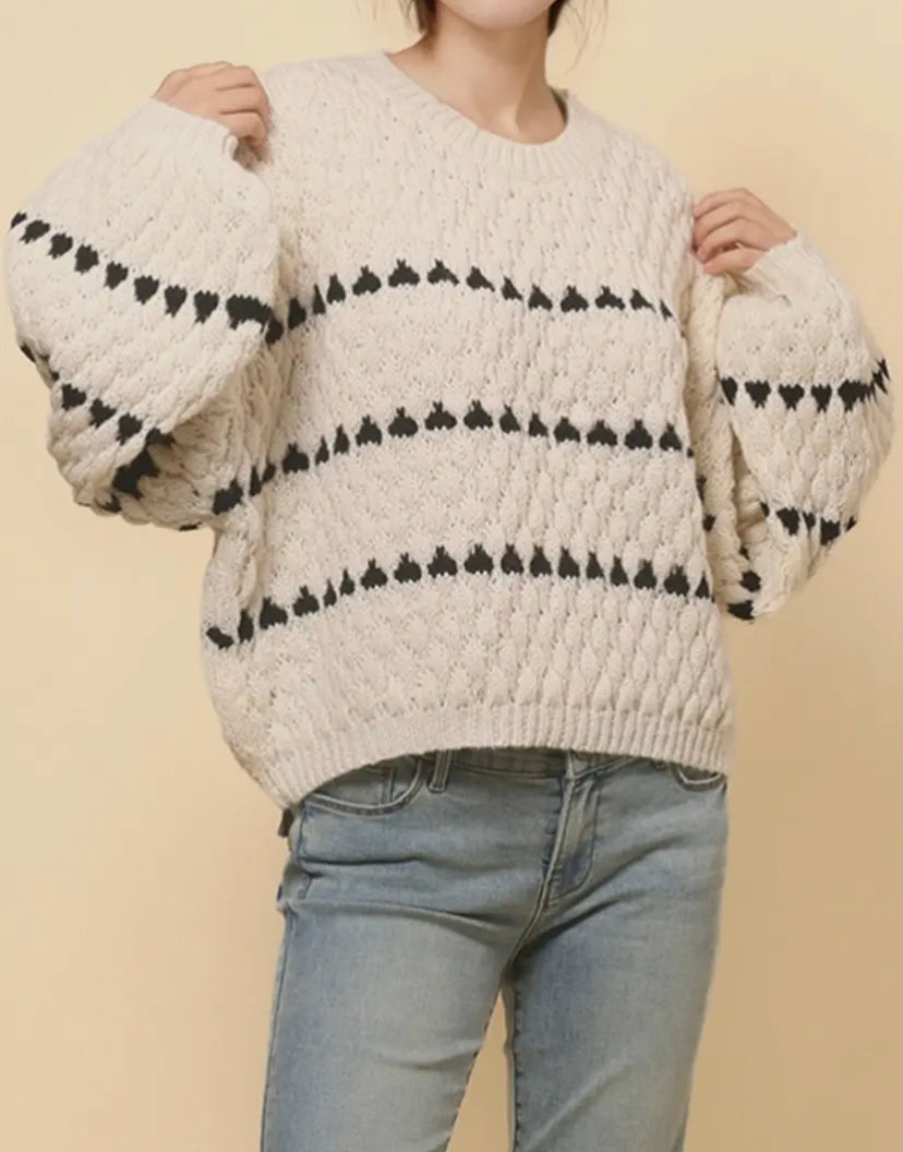 Features: * Ladies Sweater * 100% Polyester * Color Block * Long Sleeves * Lantern Sleeves * Round Neck * Heart Knit * Casual Fitting for Match Size *