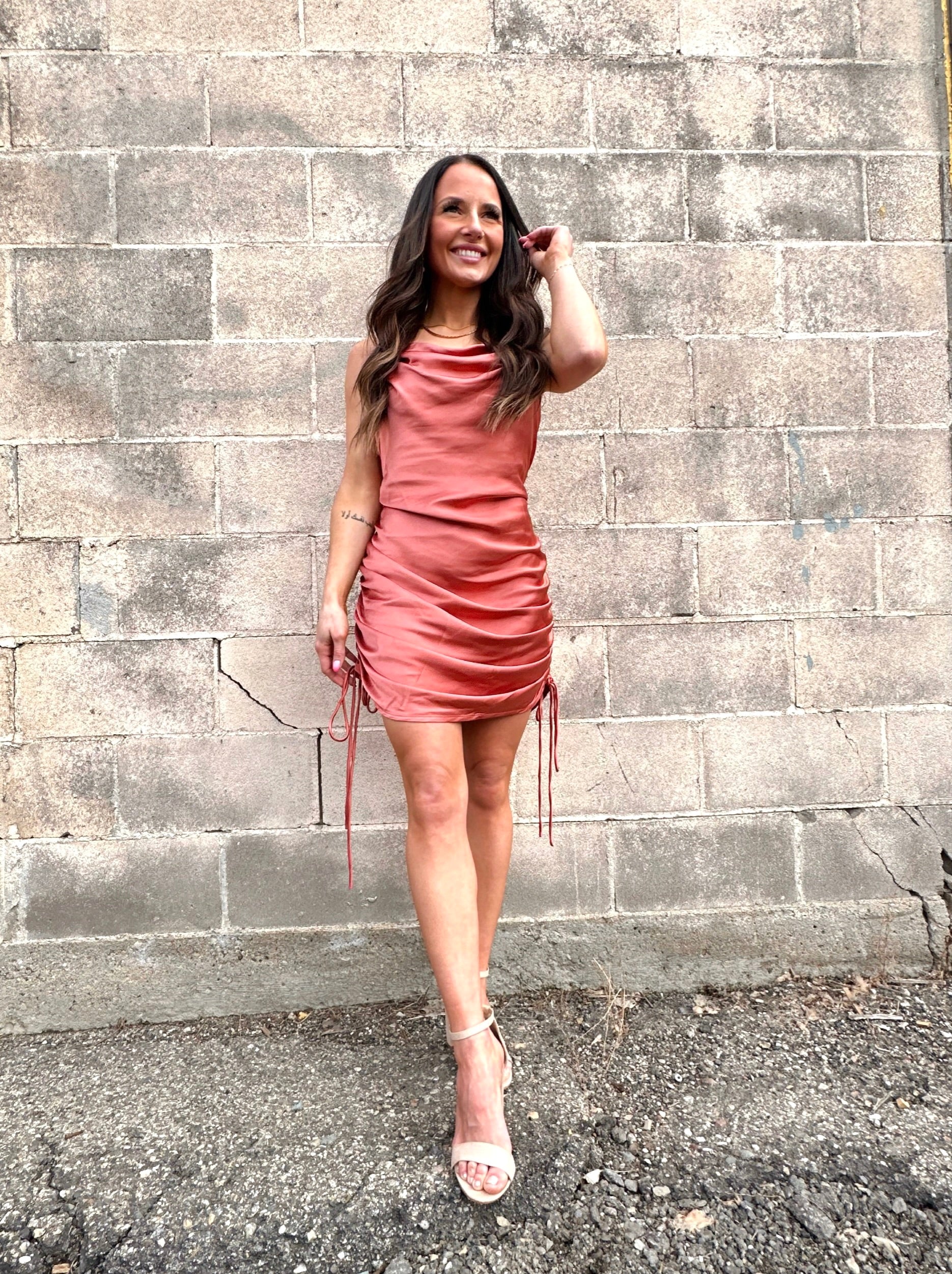 Woven Poly Span Satin Cowl Neck Strap Side Ruched Mini Dress