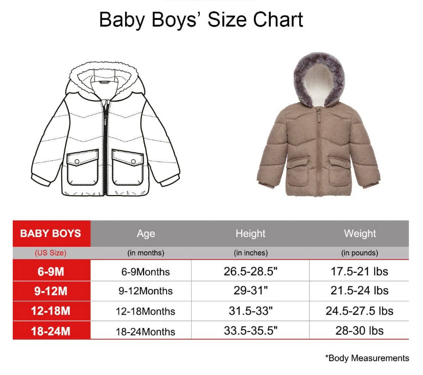 Baby Winter Jacket * 100% Polyester * Imported * Zipper closure * Machine Wash * Rokka&Rolla Baby Boys' Sherpa Fleece Lined Puffer Jacket is water-resistant to keep you dry from the rain; Down-like coat that provides the same type of warmth for your little boy * This infant toddler winter coat has down-alternative filling to provide extra heat insulation during the winter season; Maintains high thermal performance in cold and wet temperatures * Our kids' mini fur trim hooded infant puffer jacket has a quilted padded outer shell layer and skin friendly soft mini fur hood trim to keep your baby boy warm in the snow and wind; Inner soft sherpa fleece body lining to keep cuddly and fuzzy when traveling outdoors * It is a lightweight puffer jacket for little kids that is not bulky and has breathable room; Button-snap front pockets to store his candies or toys * Warm hooded arctic skin friendly soft mini fur hood that is wind-resistant to keep his head well-protected
