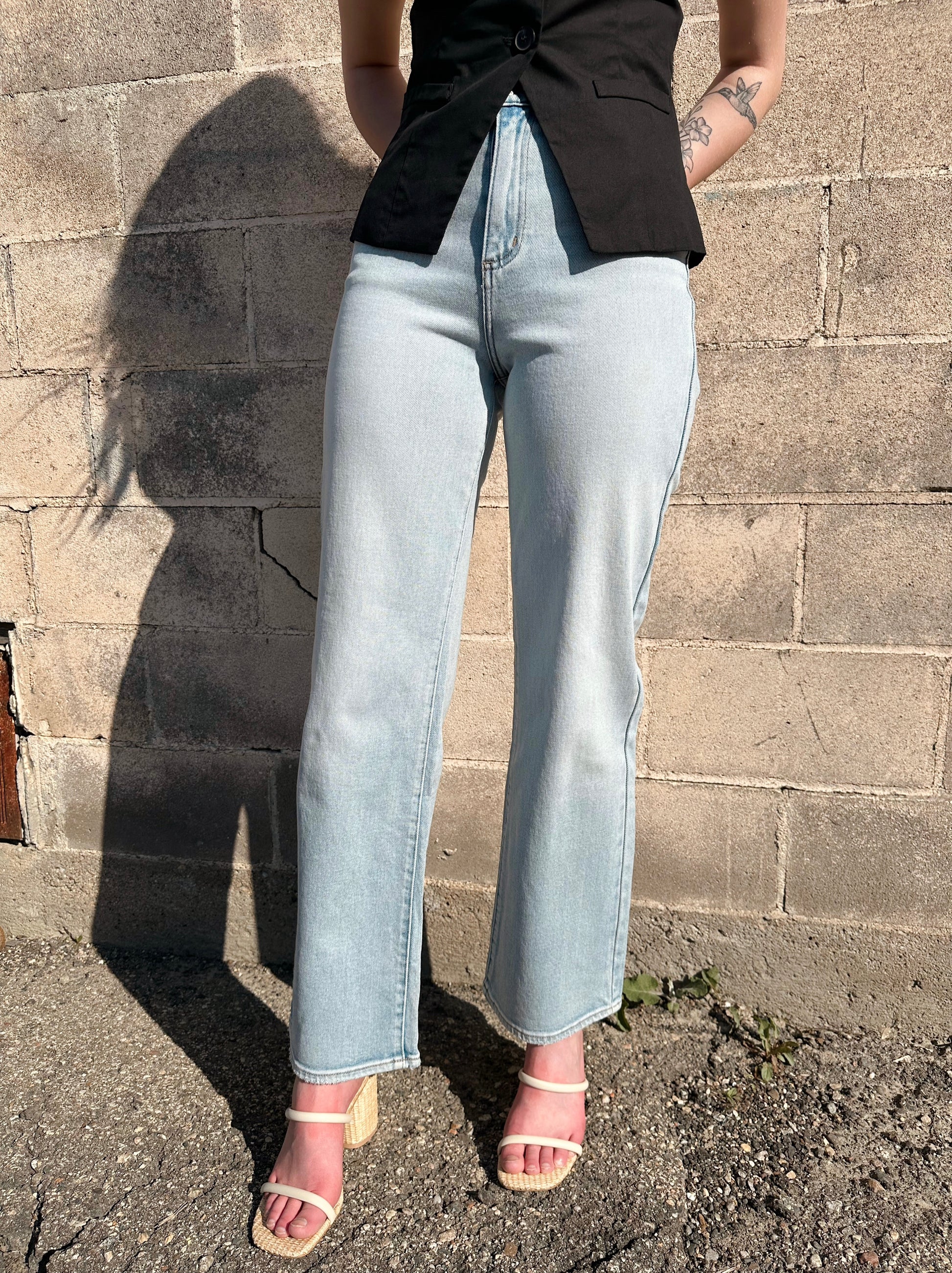 - Trouser leg jeans in a medium indigo wash