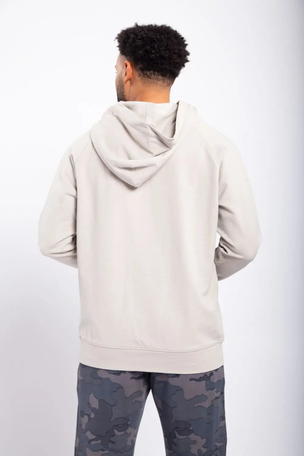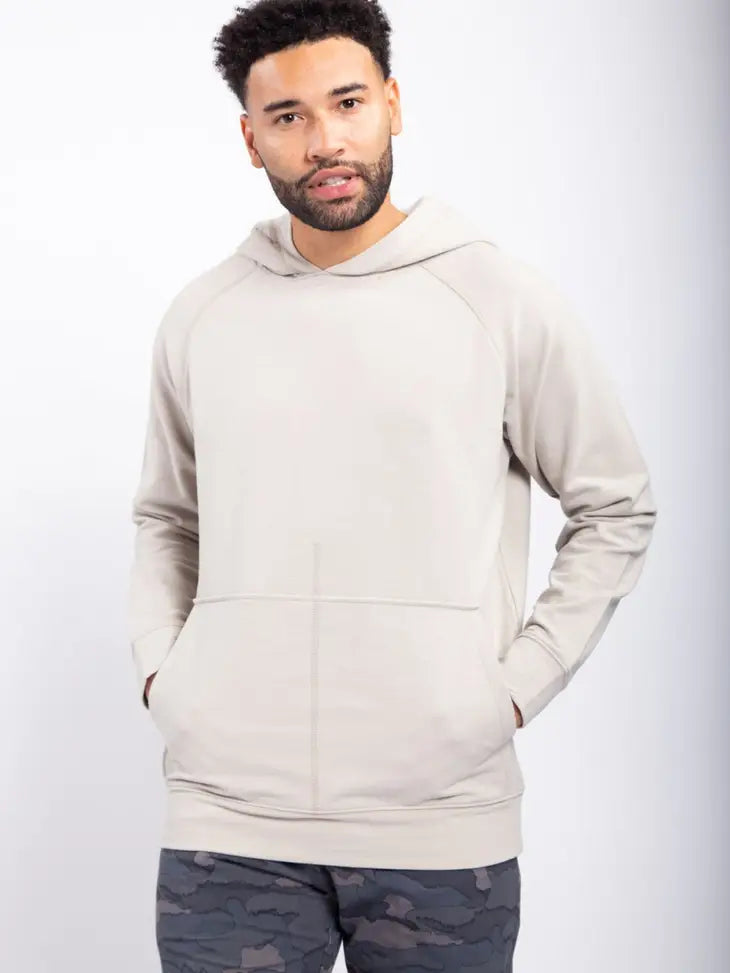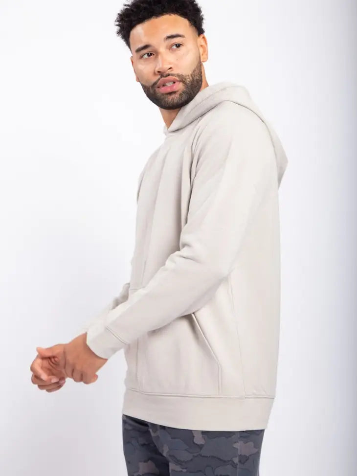 This raglan pullover hoodie features a split front pocket with a subtle stitch details, sleeves and bottom hem are cuffed.