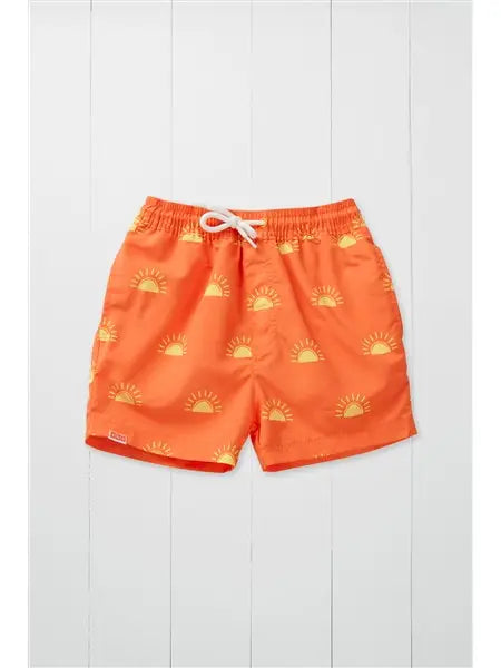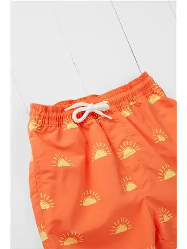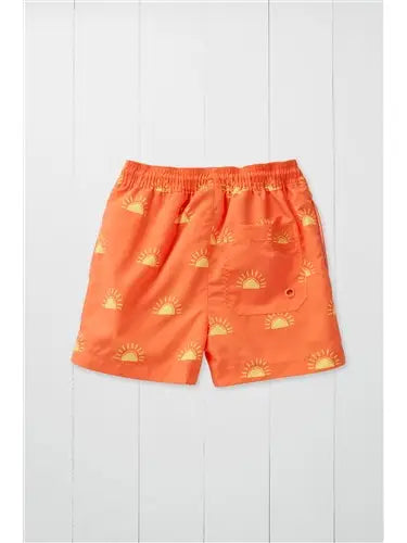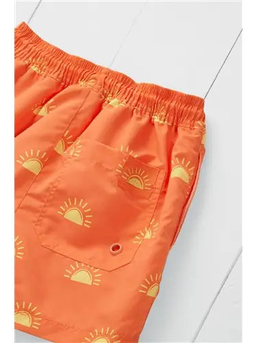 Meet our new summer essential, these orange swim shorts with a paired back sun print. These printed swimming shorts are extra special as we've made them from recycled plastic bottles saved from landfill. Not only that, this microfibre fabric is quick-drying with a peach-soft feel and UPF50+ protection. Our swimming shorts have an inner mesh lining and drawstring waist for comfort. There are side pockets and a back pocket for kids to collect their treasures. These swimming trunks are designed in a unisex fit for all babies and kids.