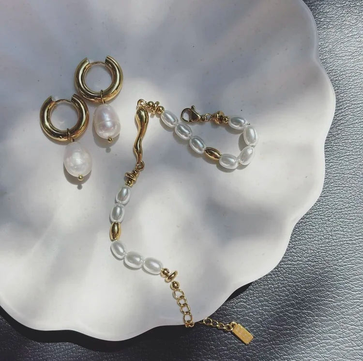 Freshwater pearls and golden details reflecting the gentle power she carries. Soft yet radiant, it’s a reminder to move through the world in your own light.