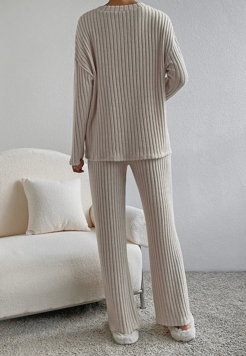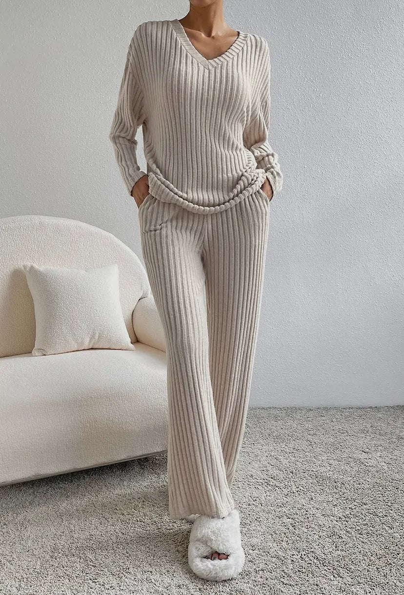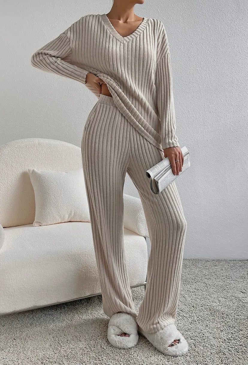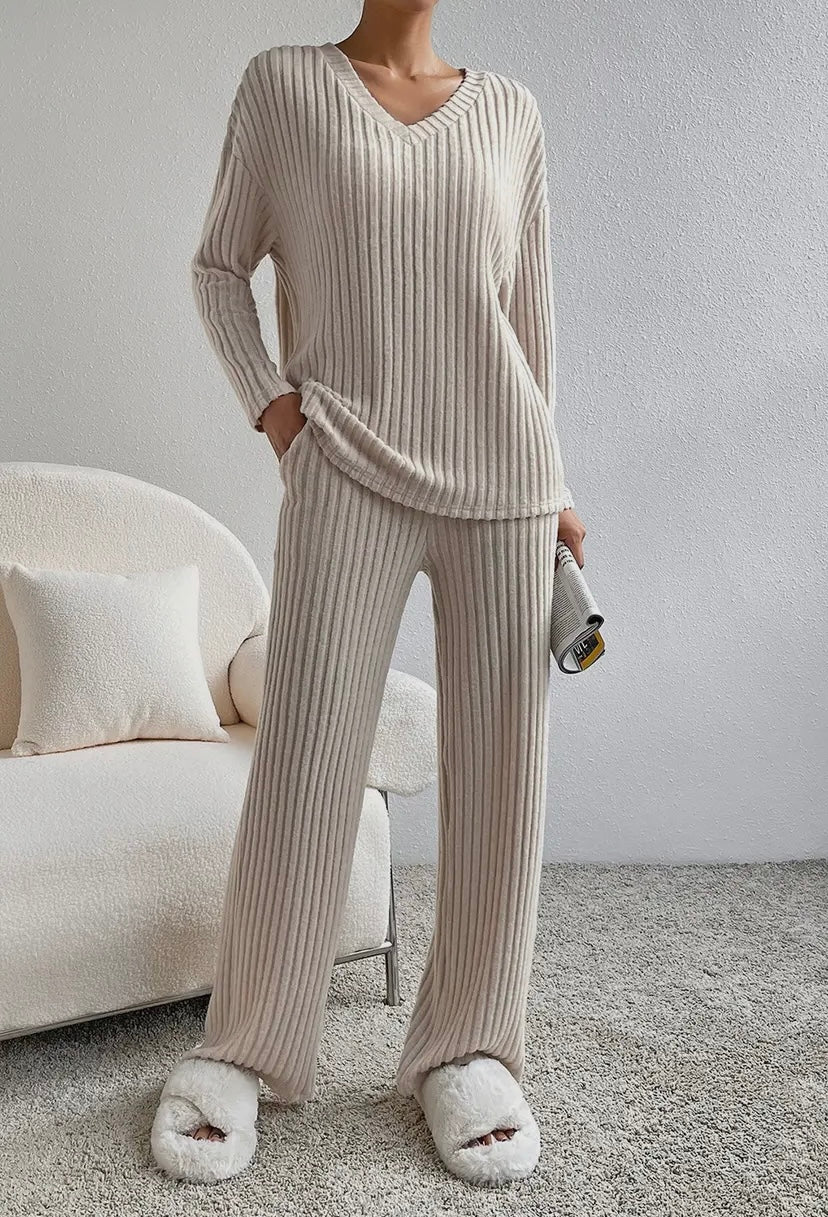 Ribbed knit for a cozy and textured look Chic V-neck design adds a touch of elegance Slouchy fit for a relaxed and comfortable feel Two-piece outfit for versatile styling options Wholesale two piece sets are very stylish and comfortable