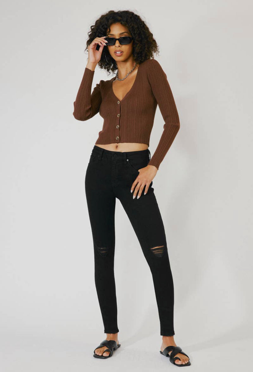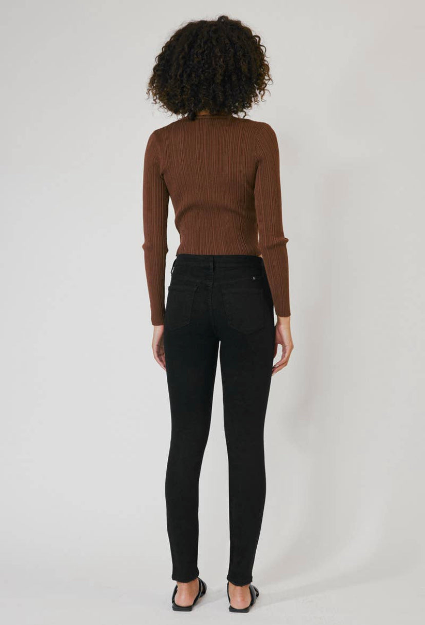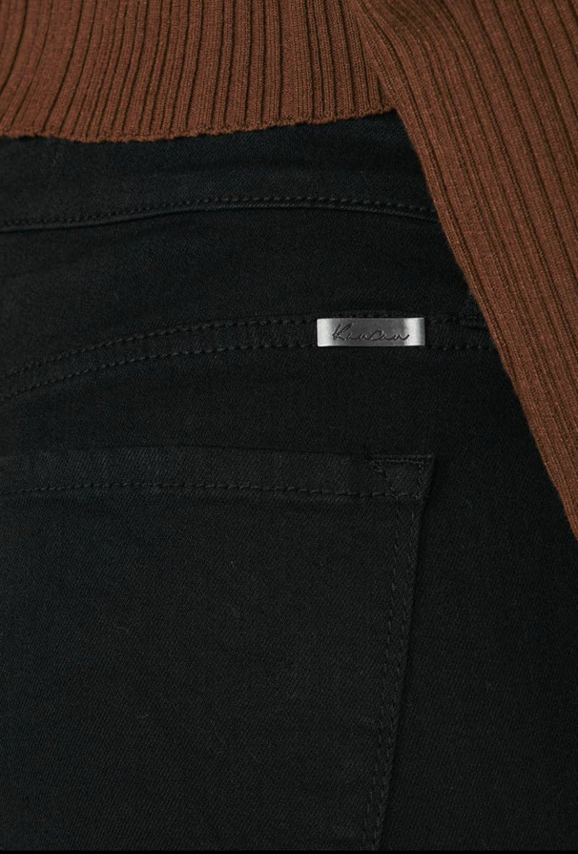 Black figure-enhancing flattering fit skinny that smoothly hug your body with an extra soft feel from above the waist through the ankle, featuring distressed detail on the knee and a bottom raw frayed hem.