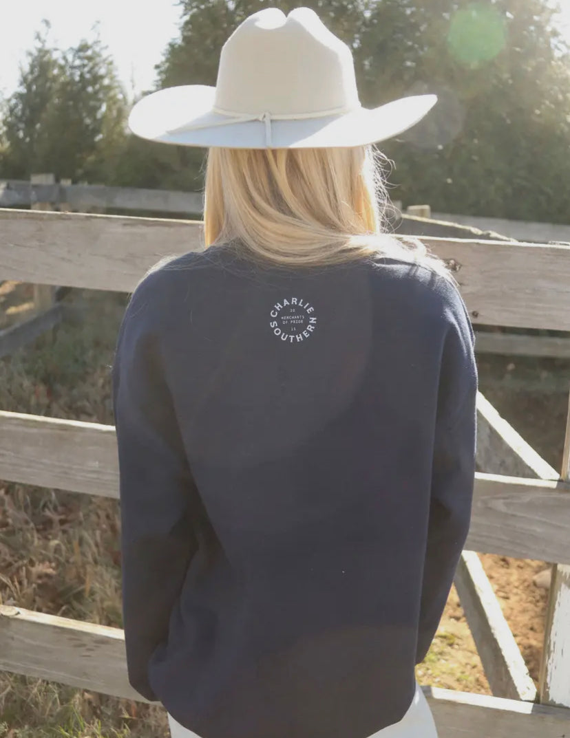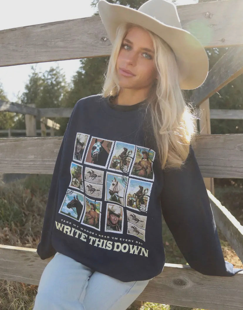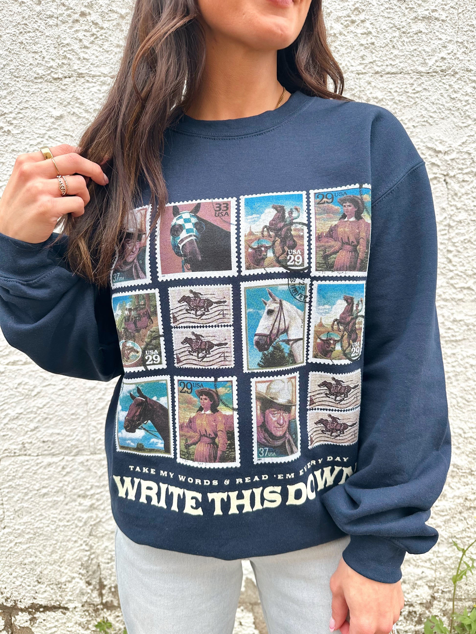 This sweatshirt is an early favorite with vintage western inspired stamps on a navy crewneck.